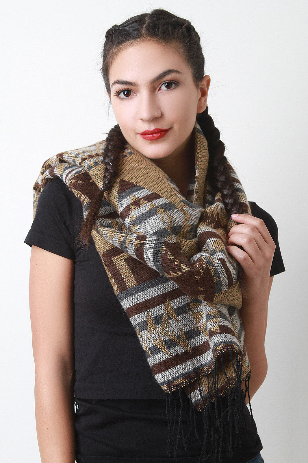 This woven knit scarf features diamond pattern tribal design, wide constructed, and fringe ends. 80% Acrylic, 20% Polyester.
