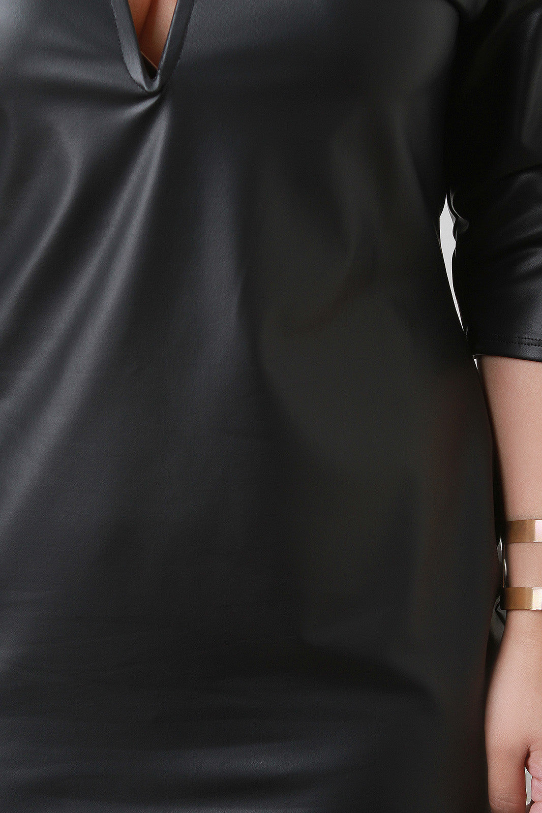 This plus size midi dress features a vegan leather fabrication, off-the-shoulder construction, v-boning sweetheart neckline, and finished with quarter-length sleeves. Accessories sold separately. Made in U.S.A. 92% Polyester, 8% Spandex.