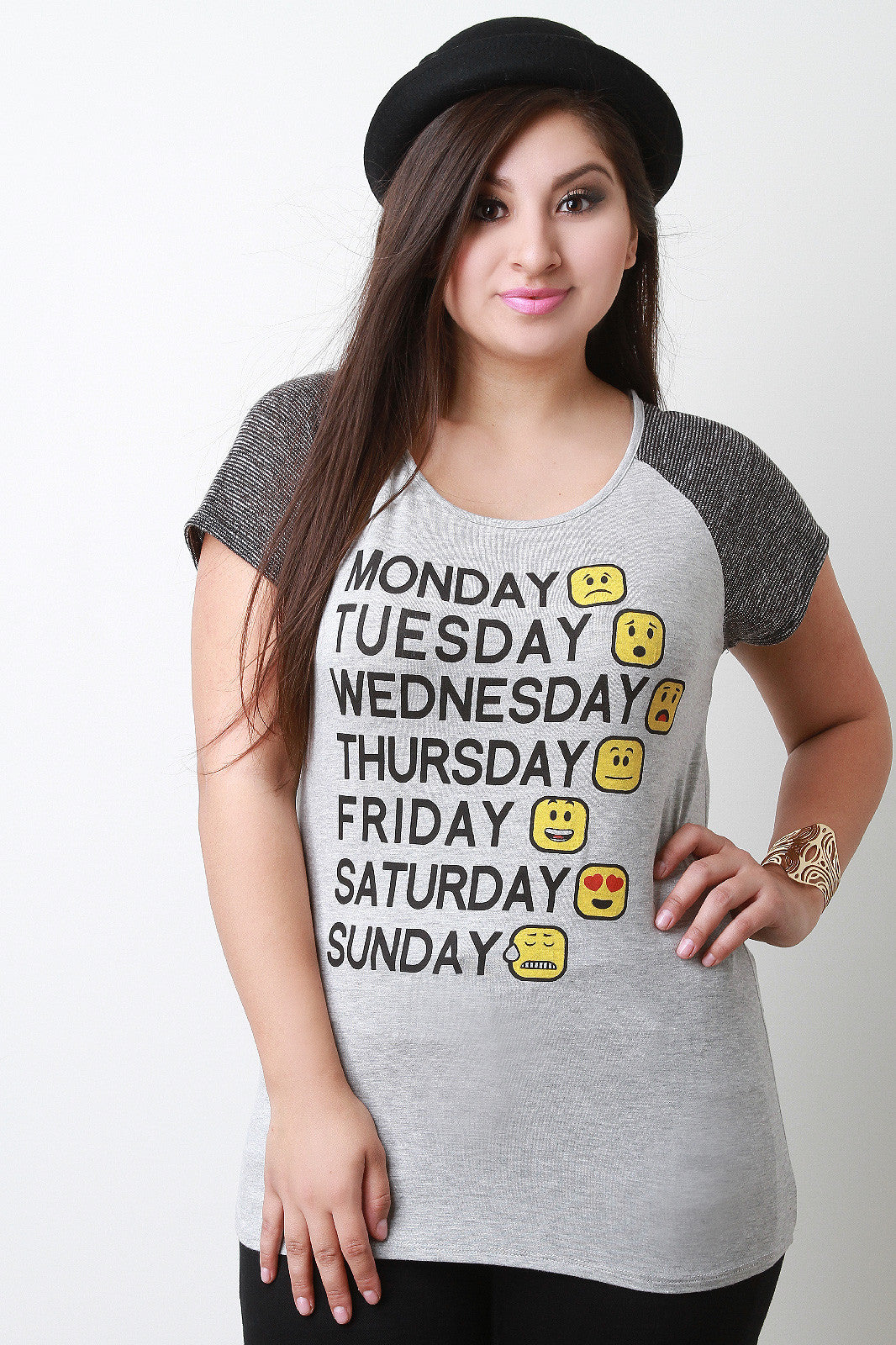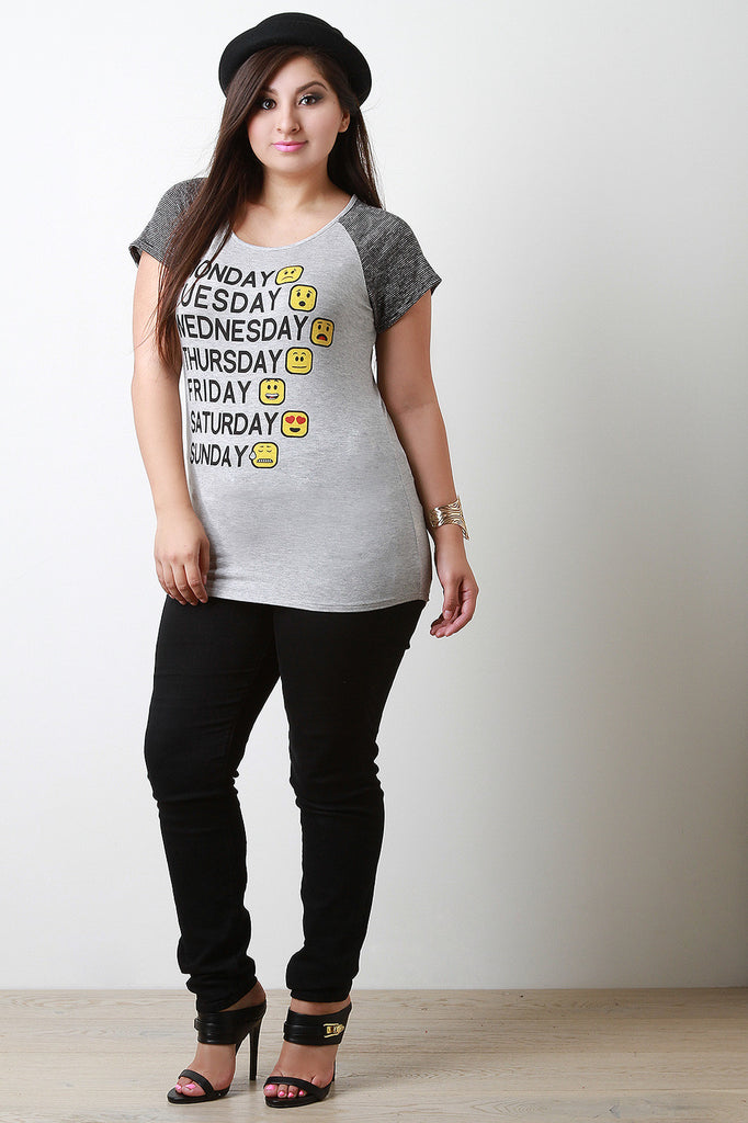 A plus size jersey tee featuring a round neckline, striped knit raglan short sleeves, and a screen print front with the days of the week and corresponding emoji faces. Accessories sold separately. 97% Rayon, 3% Spandex. Contrast: 49% Rayon, 47% Polyester, 4% Spandex.