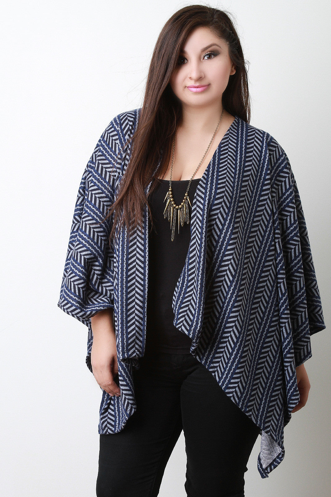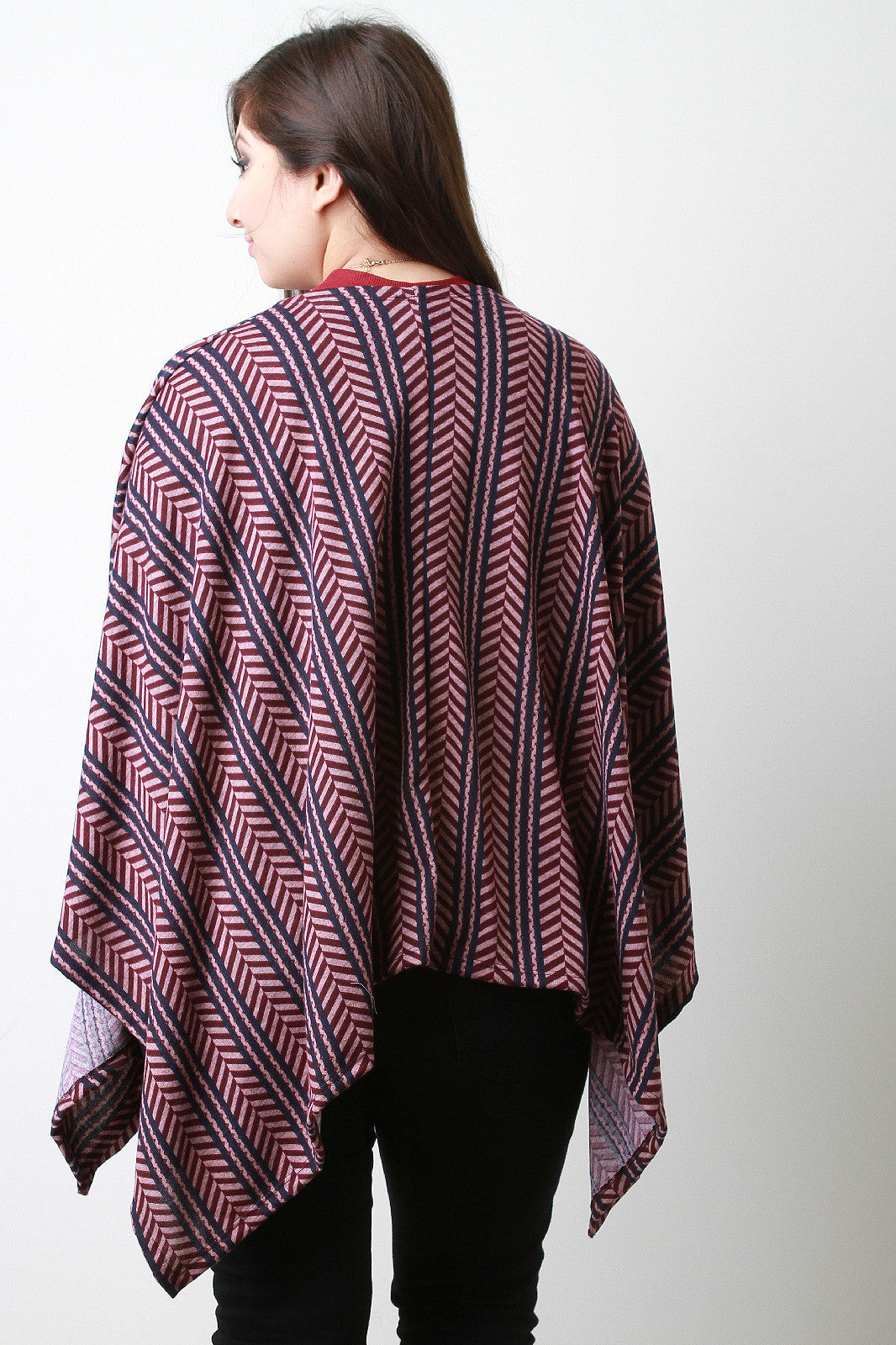 This poncho features a collarless jersey knit fabrication with an open cut at the front, and a pointed asymmetrical hemline. Accessories sold separately. Made in U.S.A. 87% Polyester, 10% Rayon, 3% Spandex.