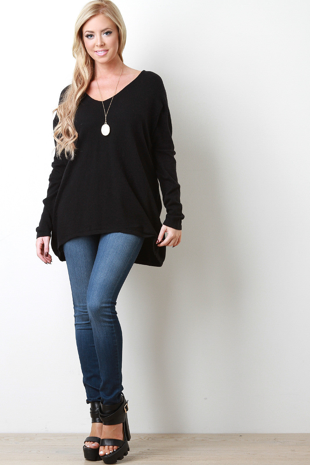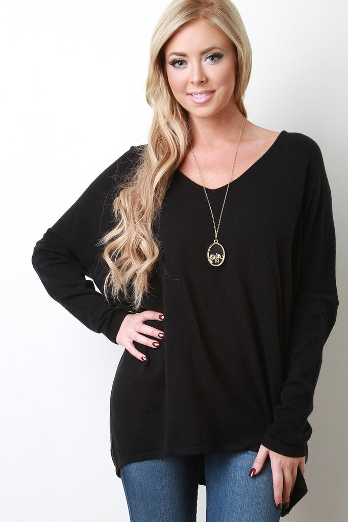 This soft knit sweater features a v-neckline, long sleeves, and a slight high low hemline. Accessories sold separately. 55% Cotton, 45% Rayon.