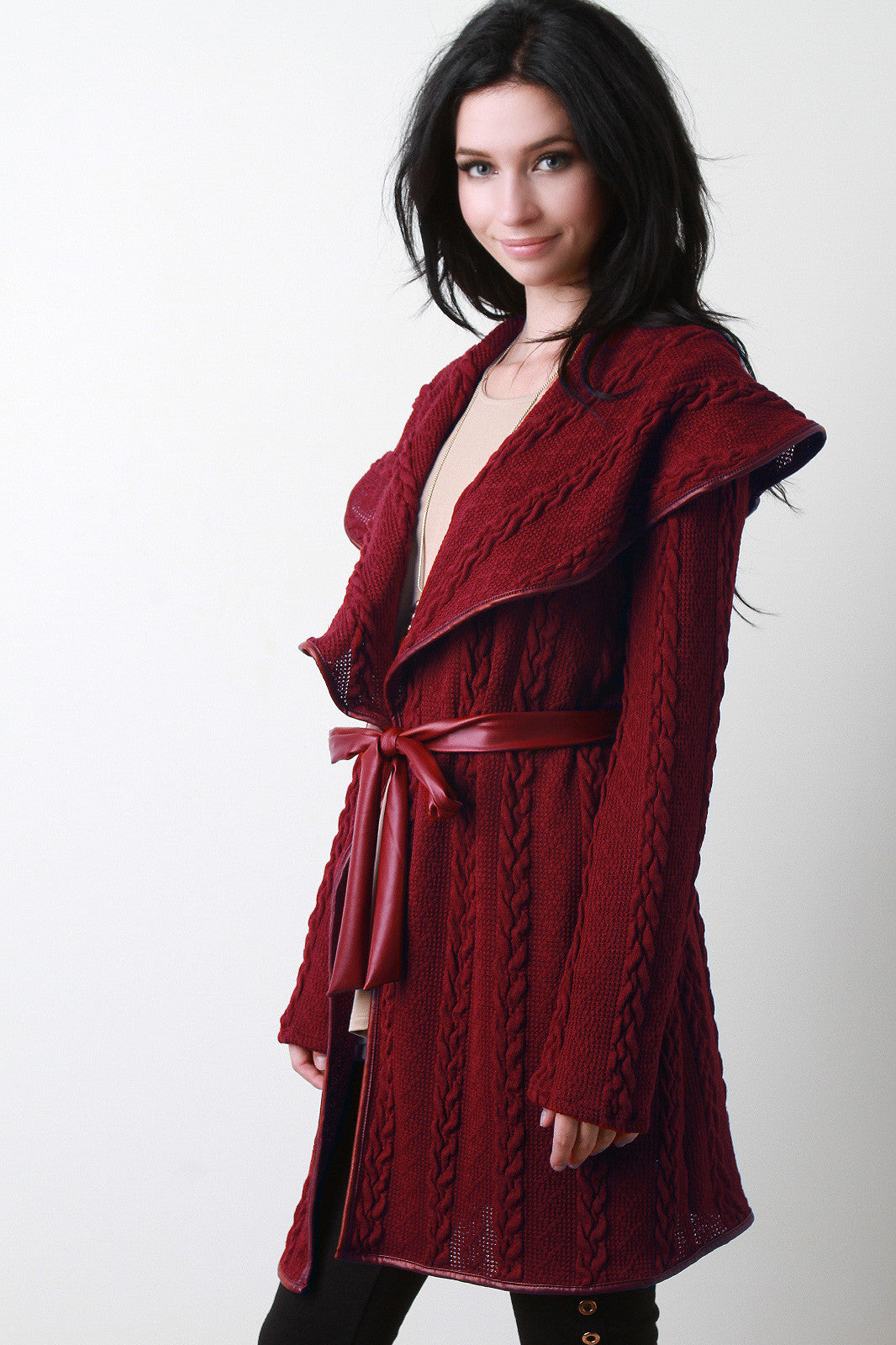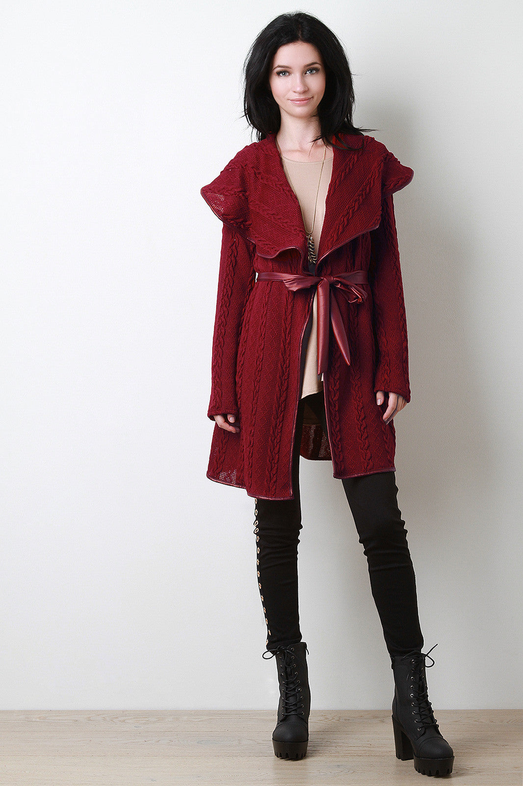 This knitted jacket features cable-like knit design, wide collar neckline, long sleeves, side belt loops, and vegan self-tie belt. Made in U.S.A. 65% Polyester, 35% Rayon. Contrast: 95% Polyester, 5% Spandex.