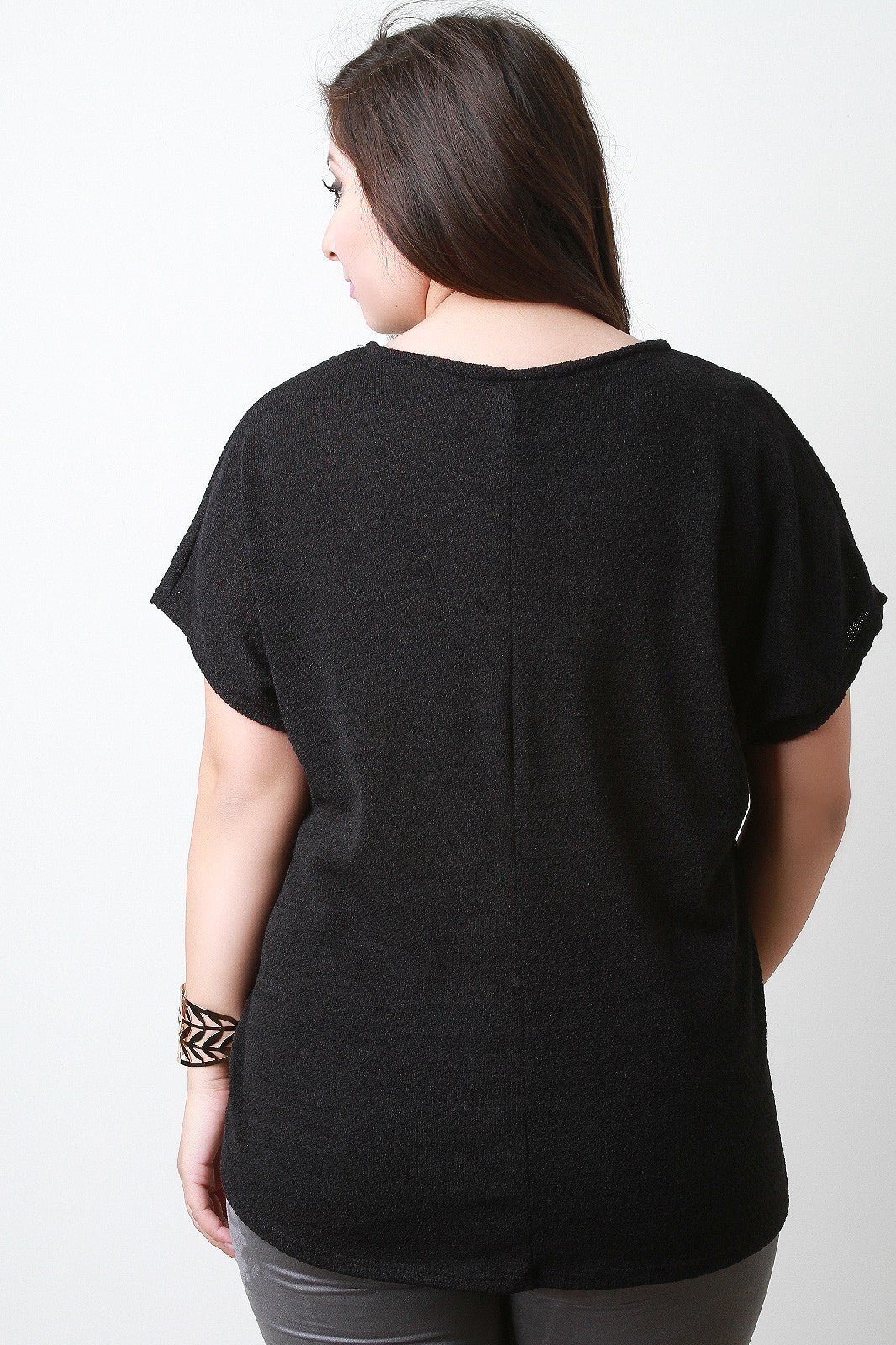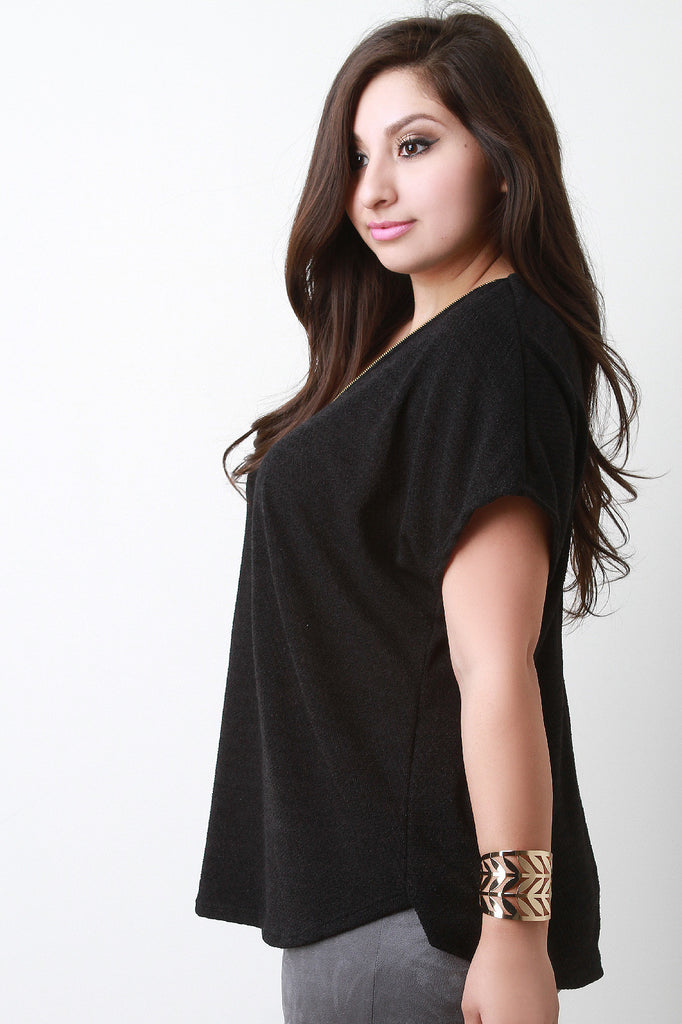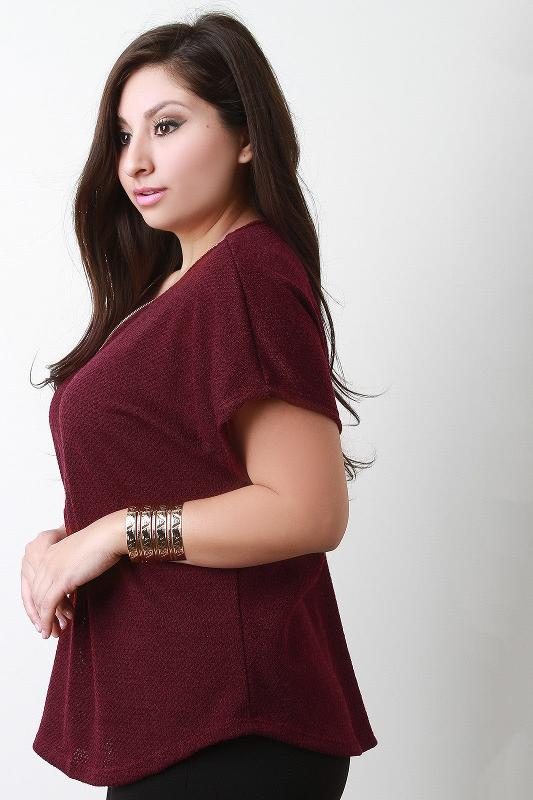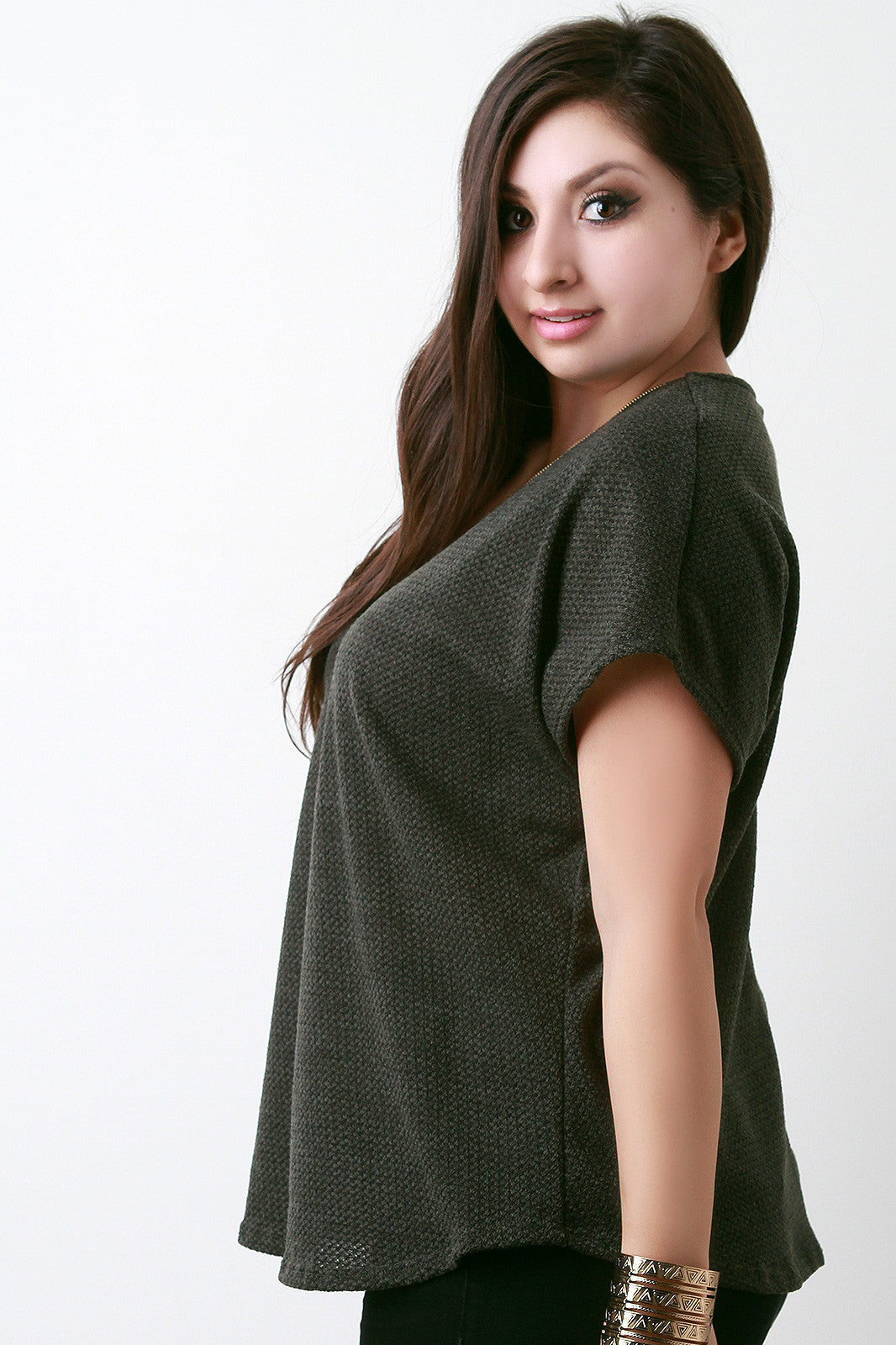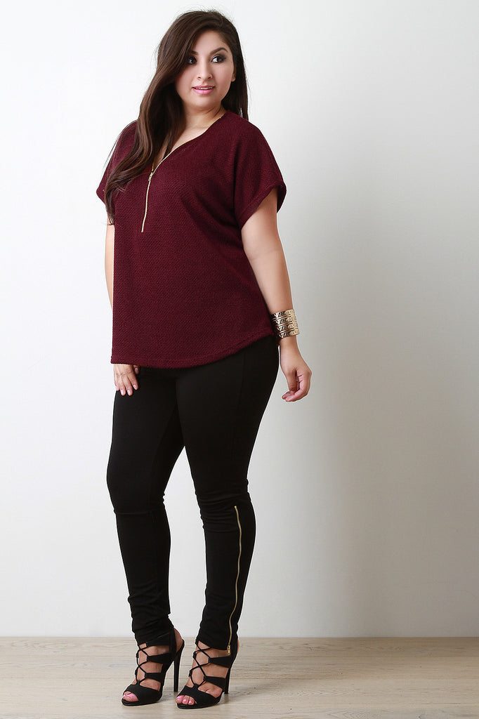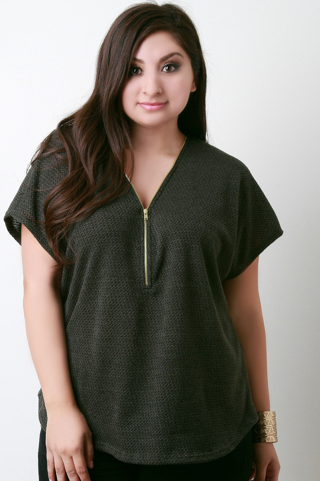 This plus size top features a v-neckline with zipper trim, short dolman sleeves, and rounded hemline. Accessories sold separately. Made in U.S.A. 95% Polyester, 5% Spandex.
