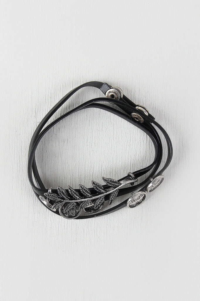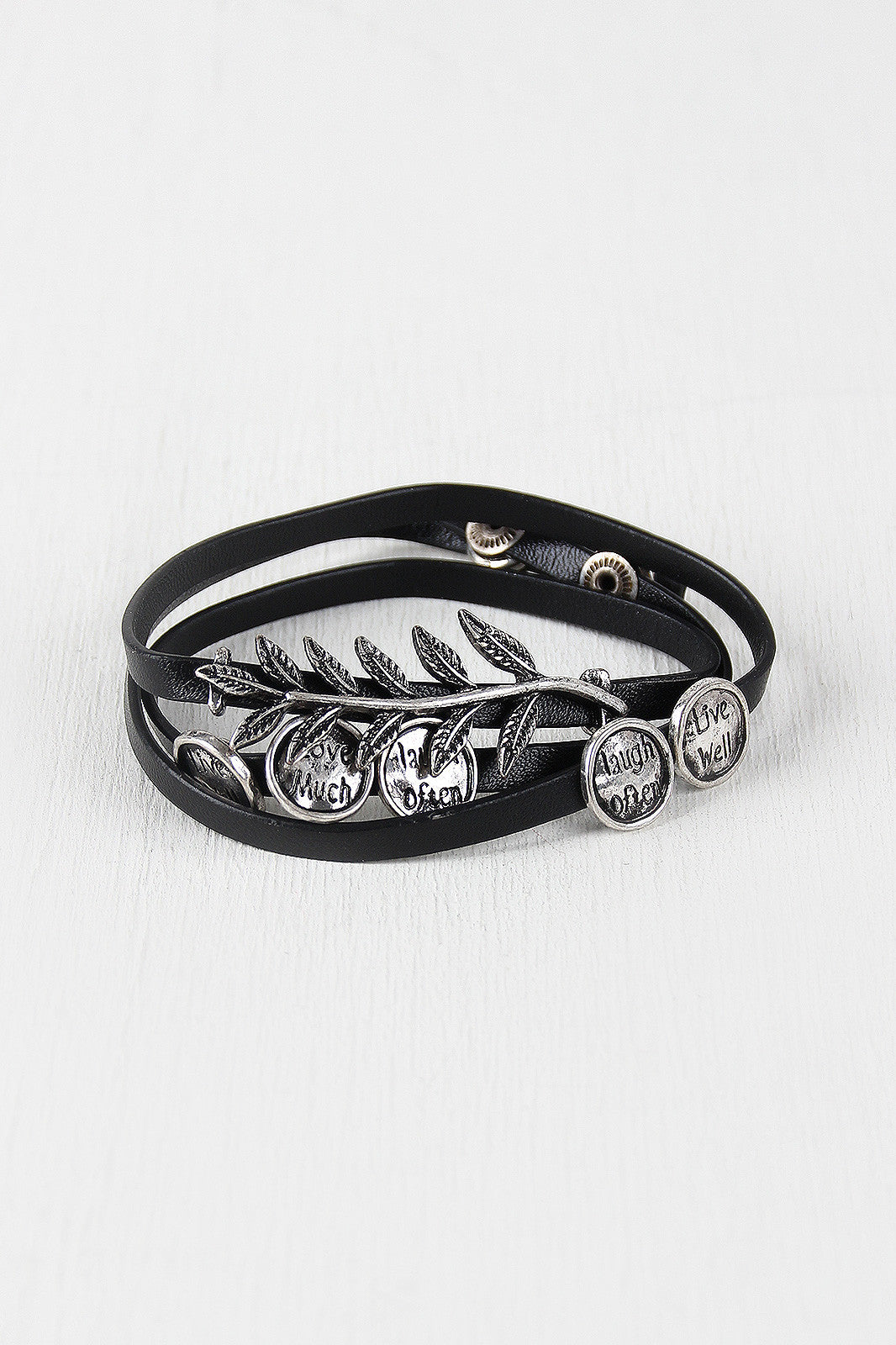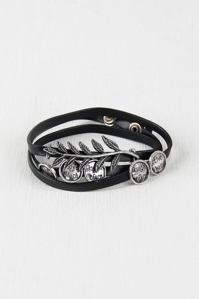 This piece of bracelet with sliding plates, including a feather and three different types of idioms that are: Live Well, Love Much and Laugh Often.