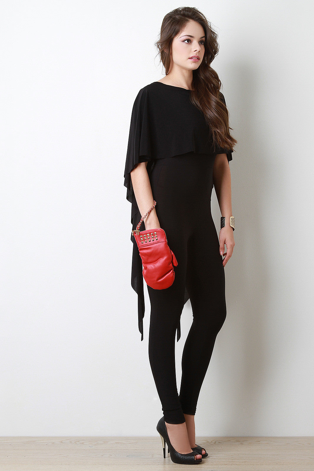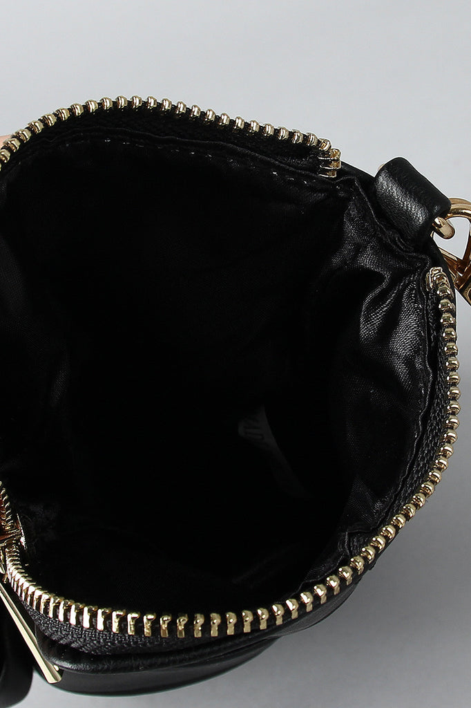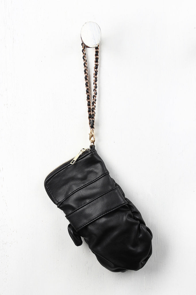 This vegan leather clutch has a boxing glove design featuring studs at the front, a wide strap along the back, and zipper closure. Finished with a satin interior lining and includes a detachable threaded chain strap.