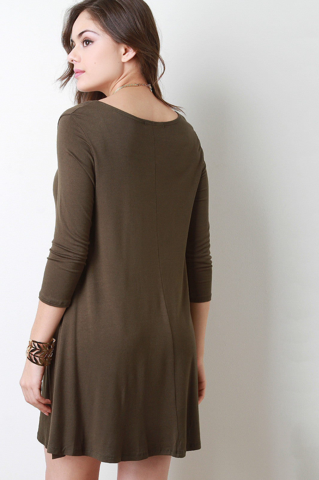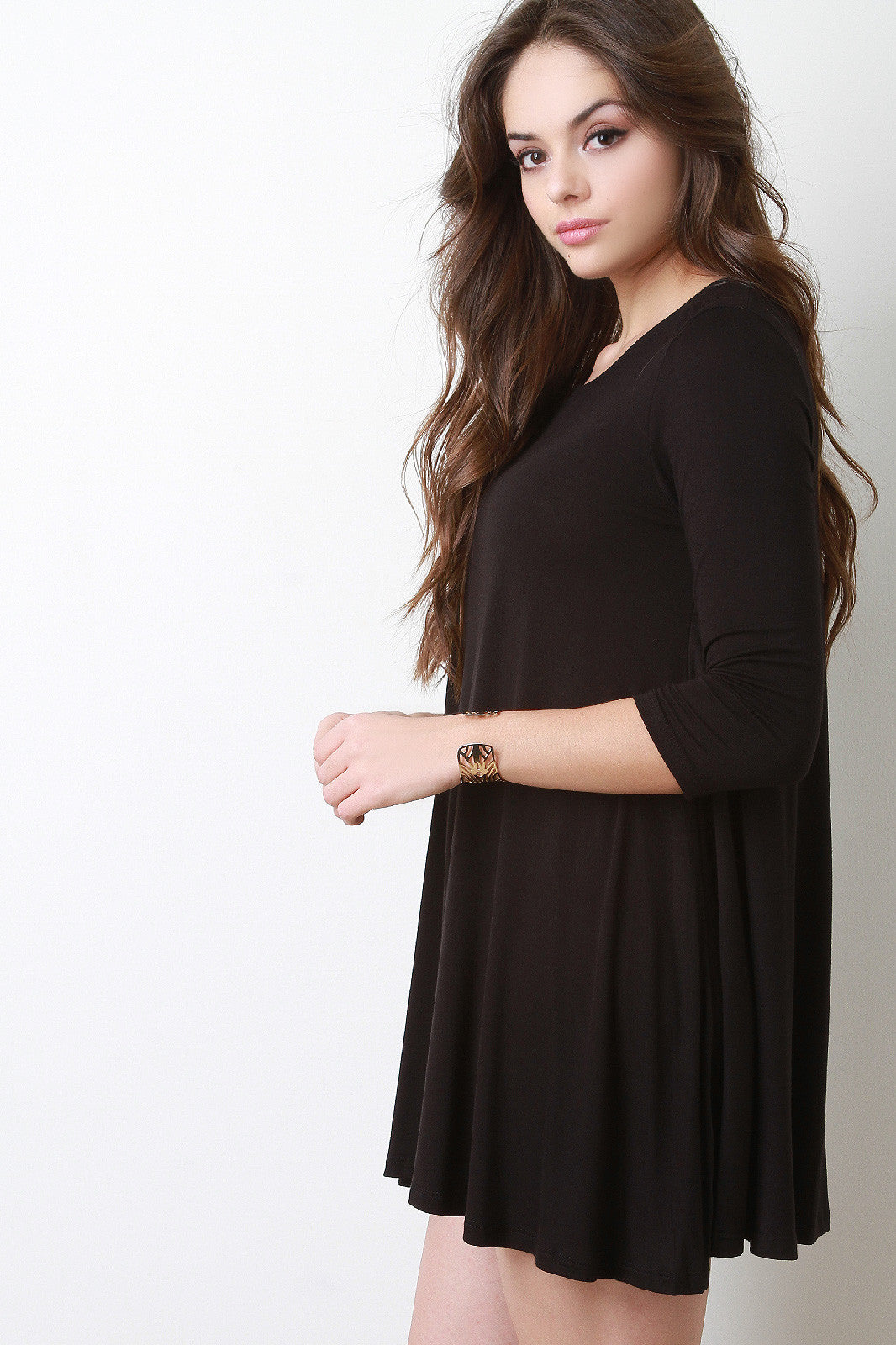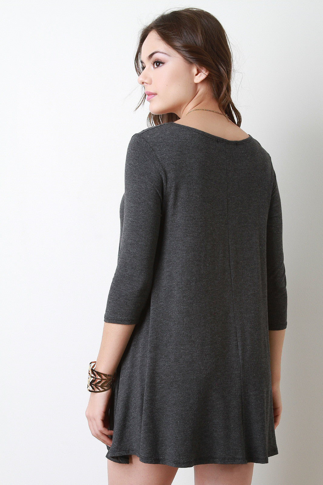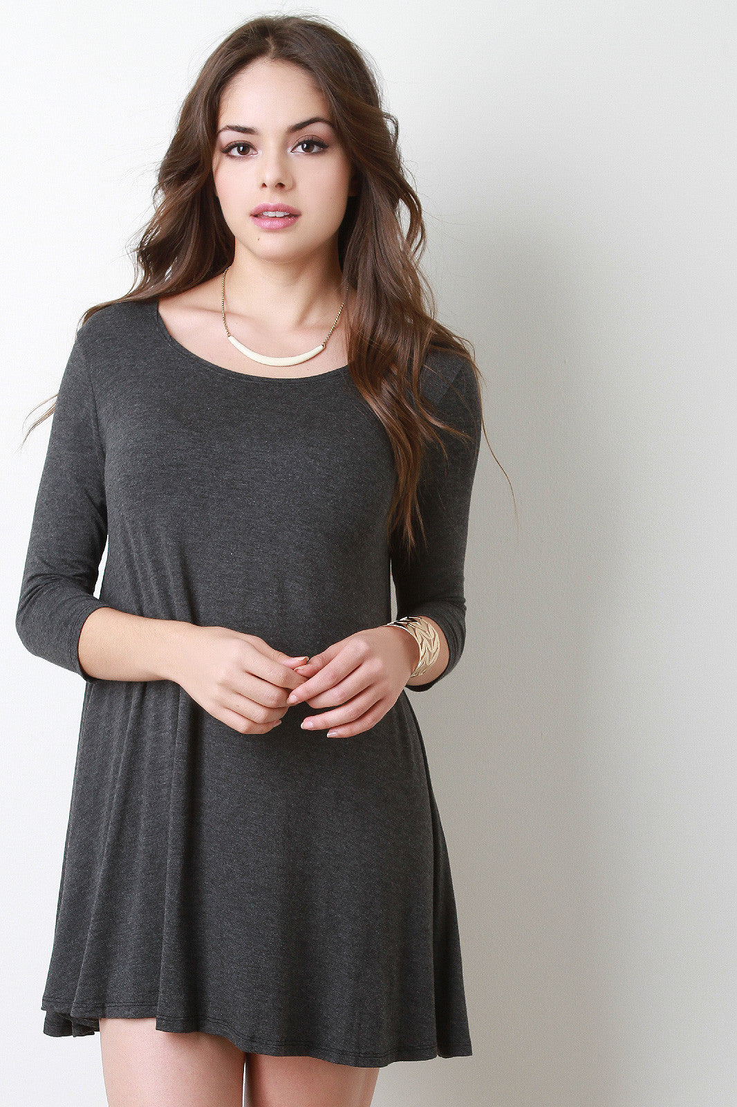 This mini dress features a jersey knit fabrication with a round neckline and round, semi-lose hem. The sleeves are three quarters in size. Accessories sold separately. Made in U.S.A. 96% Rayon, 4% Spandex.