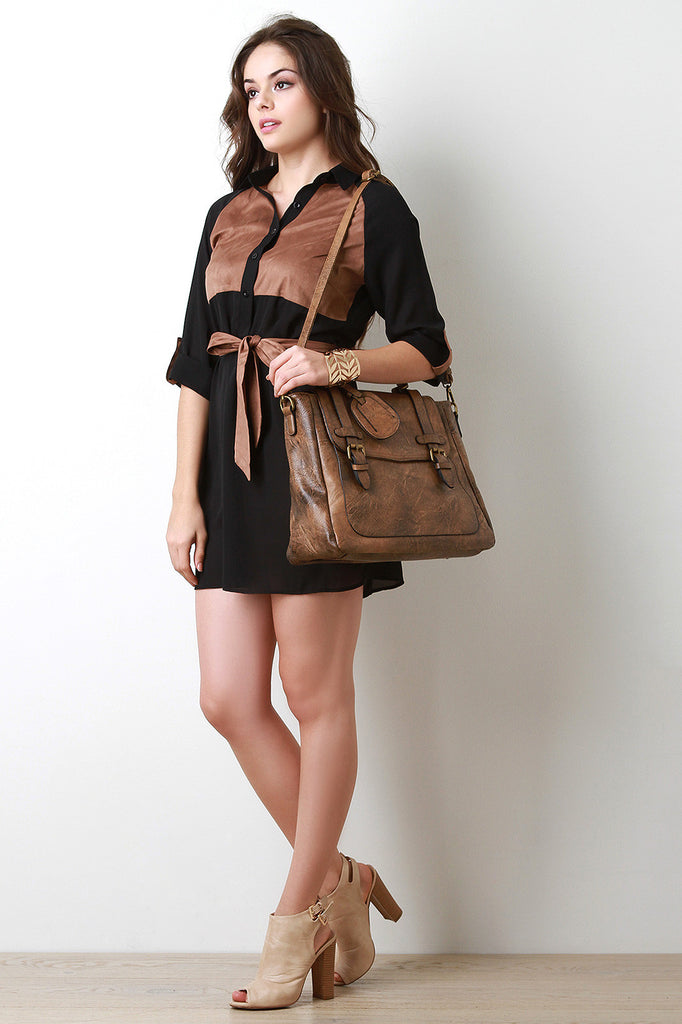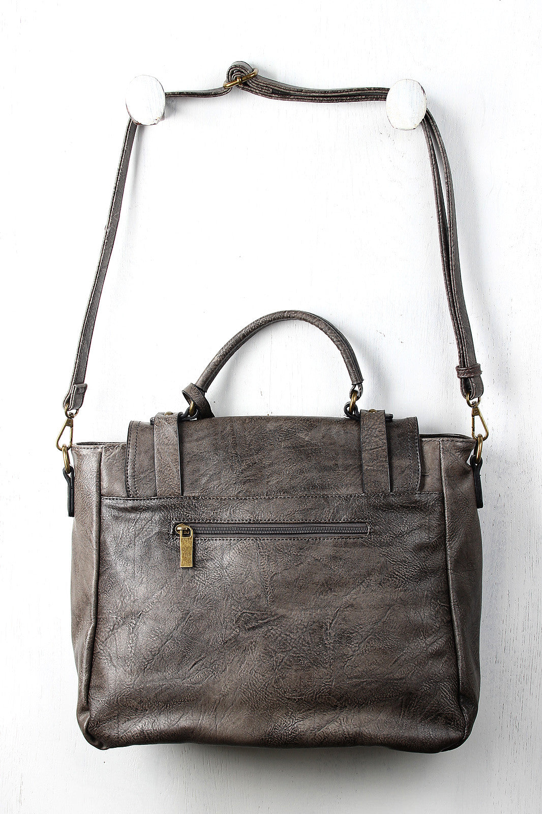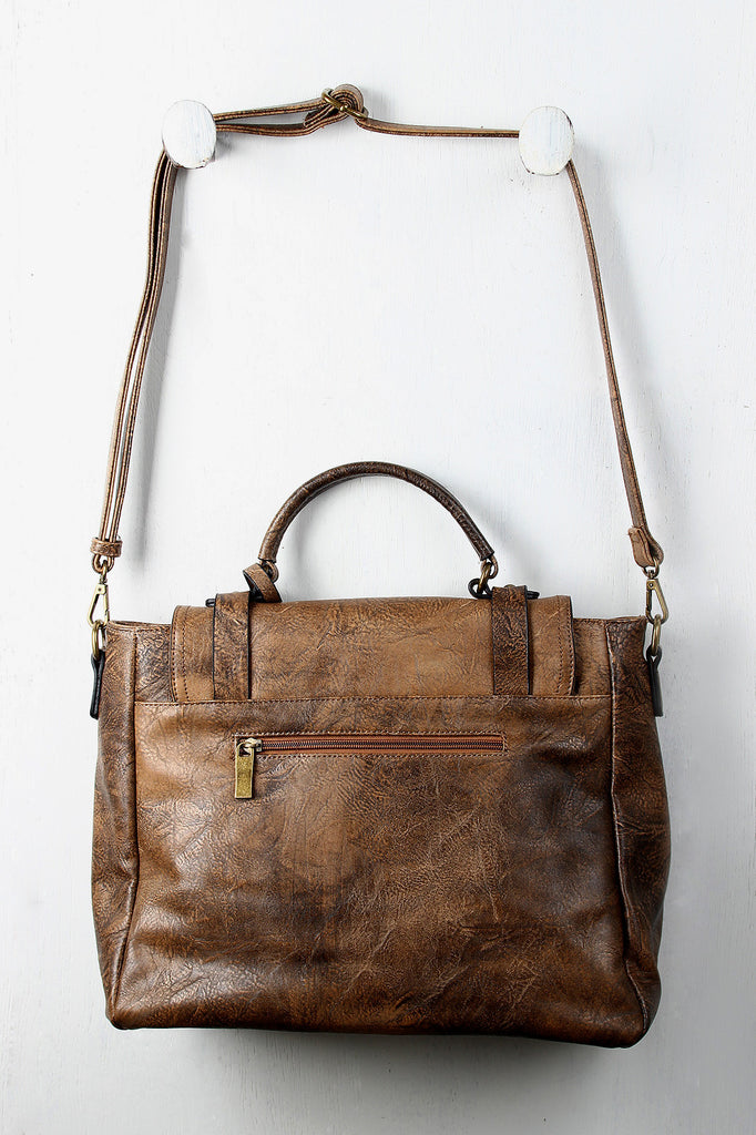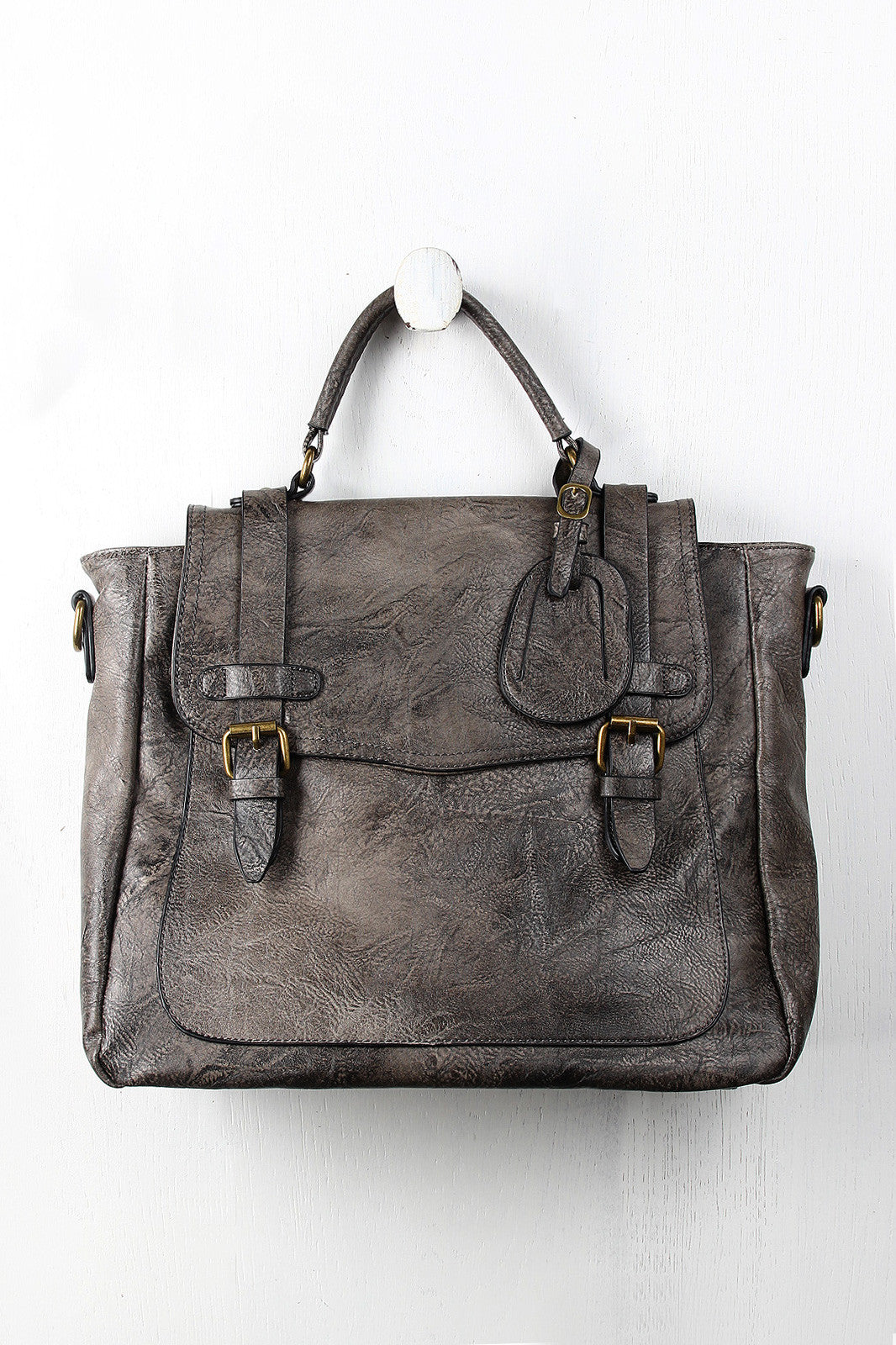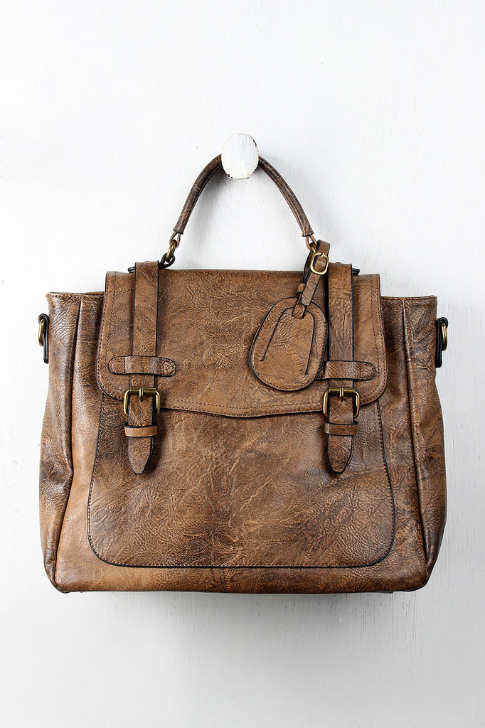 A book bag-inspired satchel featuring distressed vegan leather, top handle with a 4" drop, and a belted straps front flap secured with magnetic buttons. The main compartment has a zipper top and divided interior with two zipper pockets and two slip pockets. Bag is finished with an exterior front slip pocket and a back zipper pocket. Includes a removable luggage tag and adjustable shoulder strap.