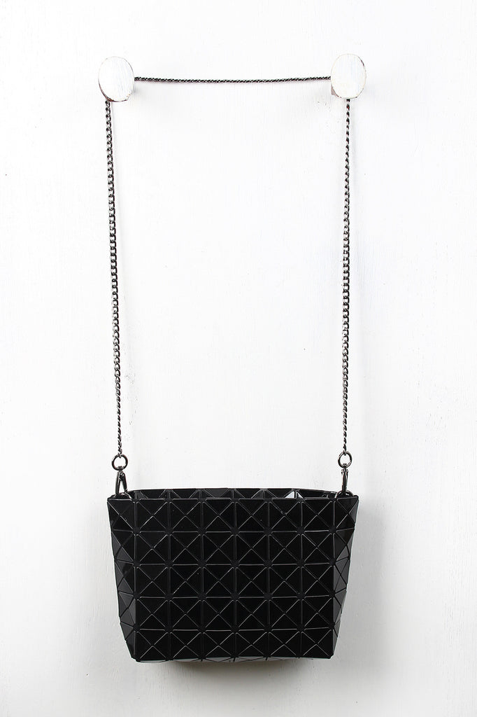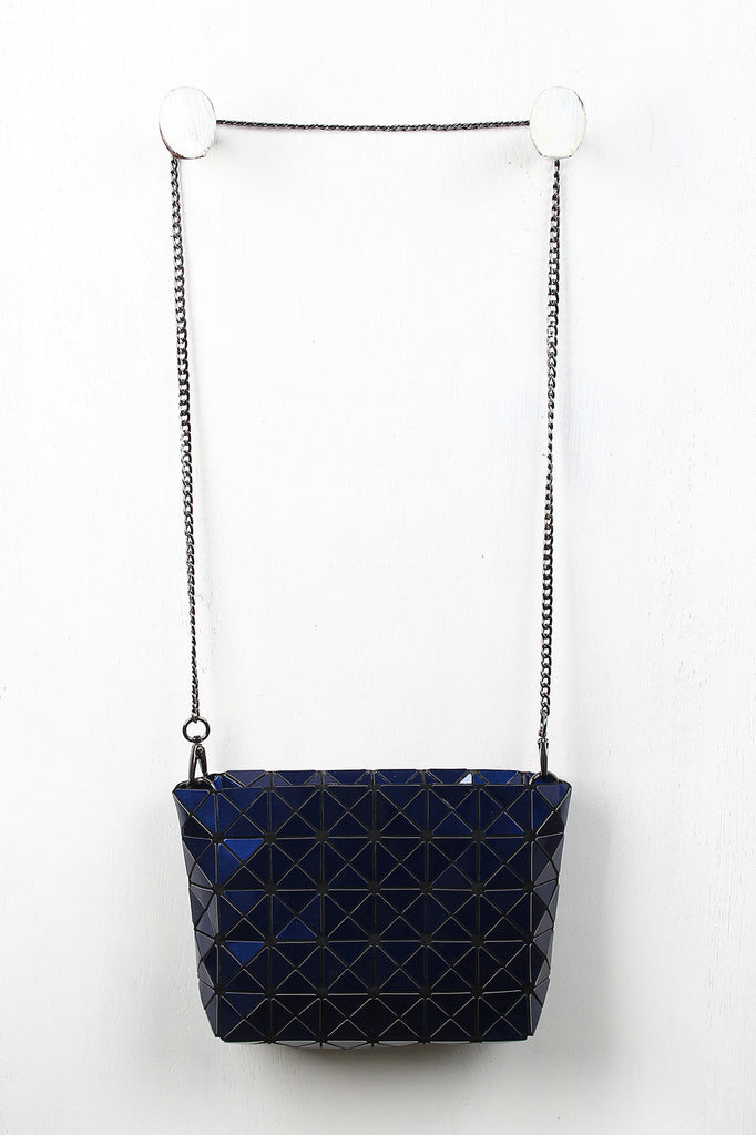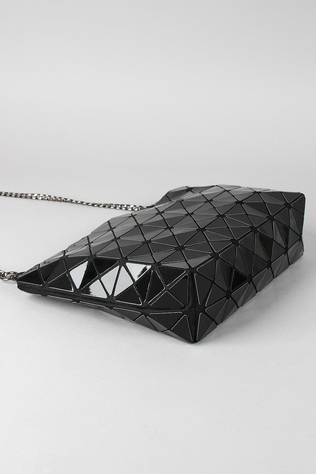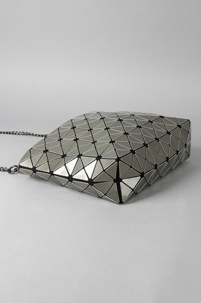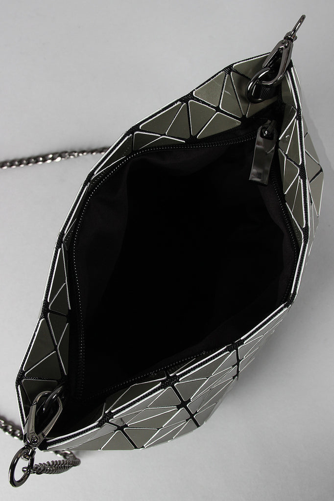 A rectangular shoulder glossy prism-paneled design , top zipper closure, and interior lining. Bag includes detachable curb link shoulder chain with a 22" drop.