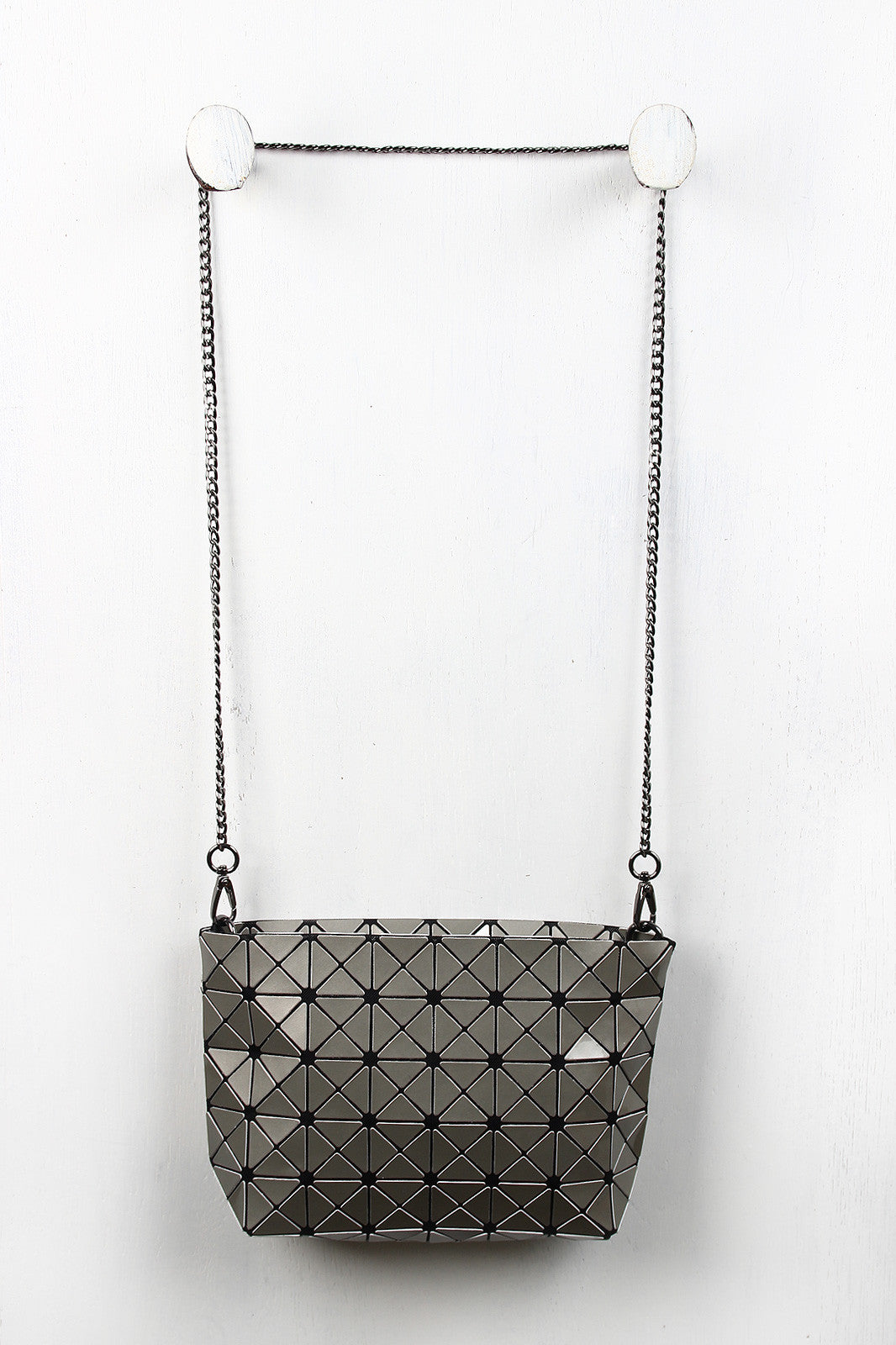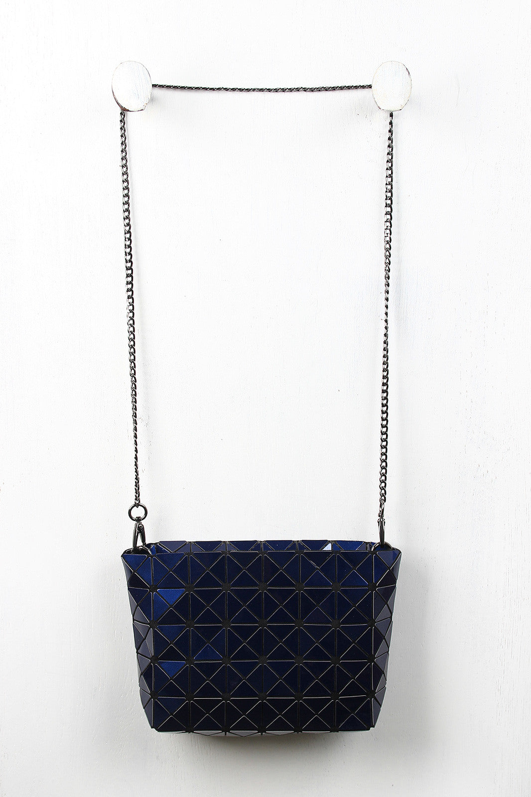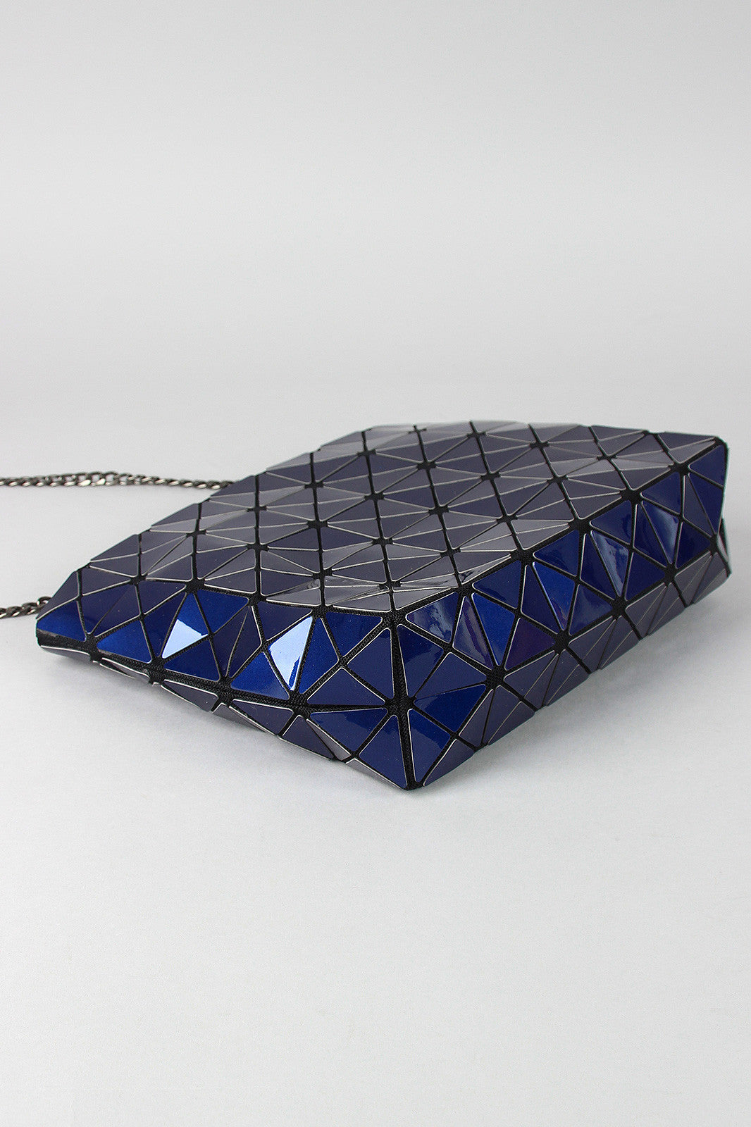 A rectangular shoulder glossy prism-paneled design , top zipper closure, and interior lining. Bag includes detachable curb link shoulder chain with a 22" drop.