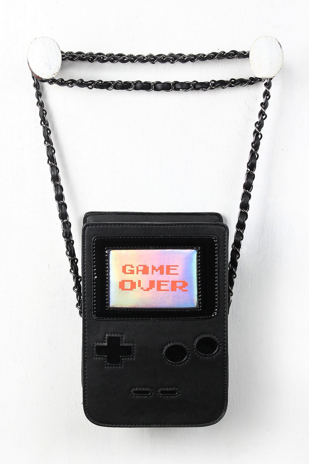 Don't got game? Let this bag help you out. It features a retro gaming device design with vegan leather, an iridescent front panel, and indented glossy "buttons." Bag has a top zipper closure, interior lining with a single slip pocket, and a threaded shoulder chain with a 22" drop.