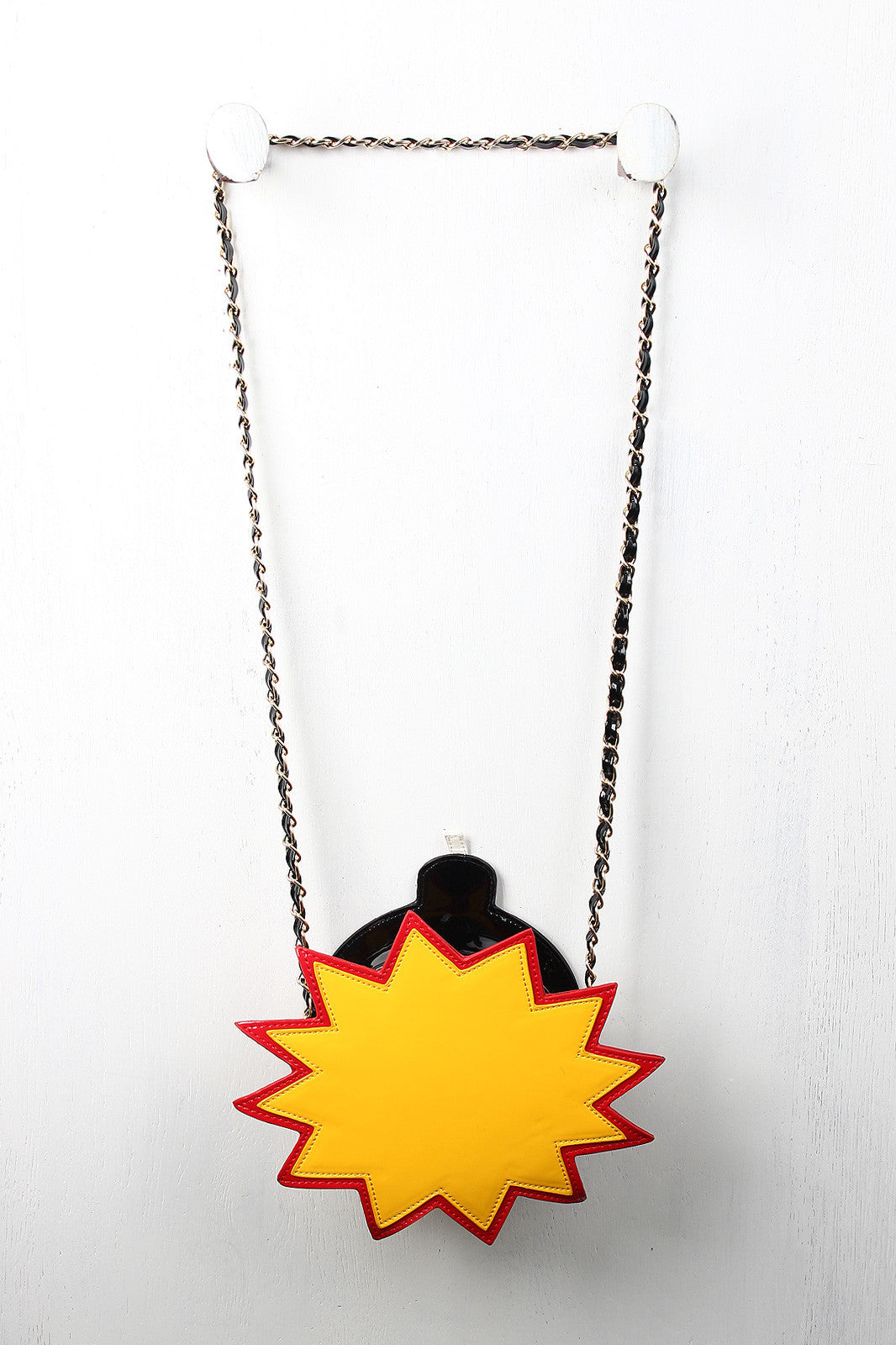 Got a short fuse? This is the bag for you! This novelty bag features a cartoon bomb design at the front and a comic explosion at the back in patent faux leather with a zipper closure and threaded shoulder chain (23" drop).