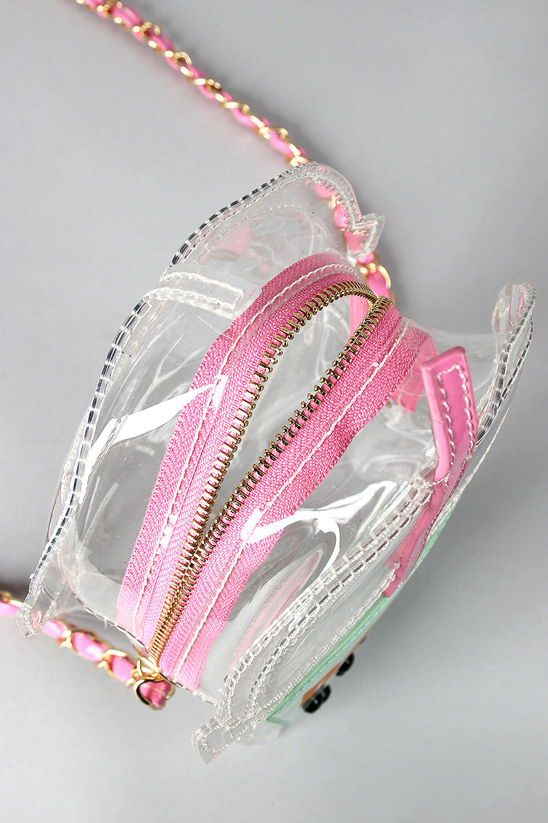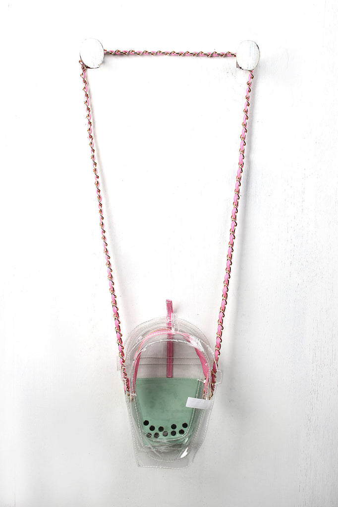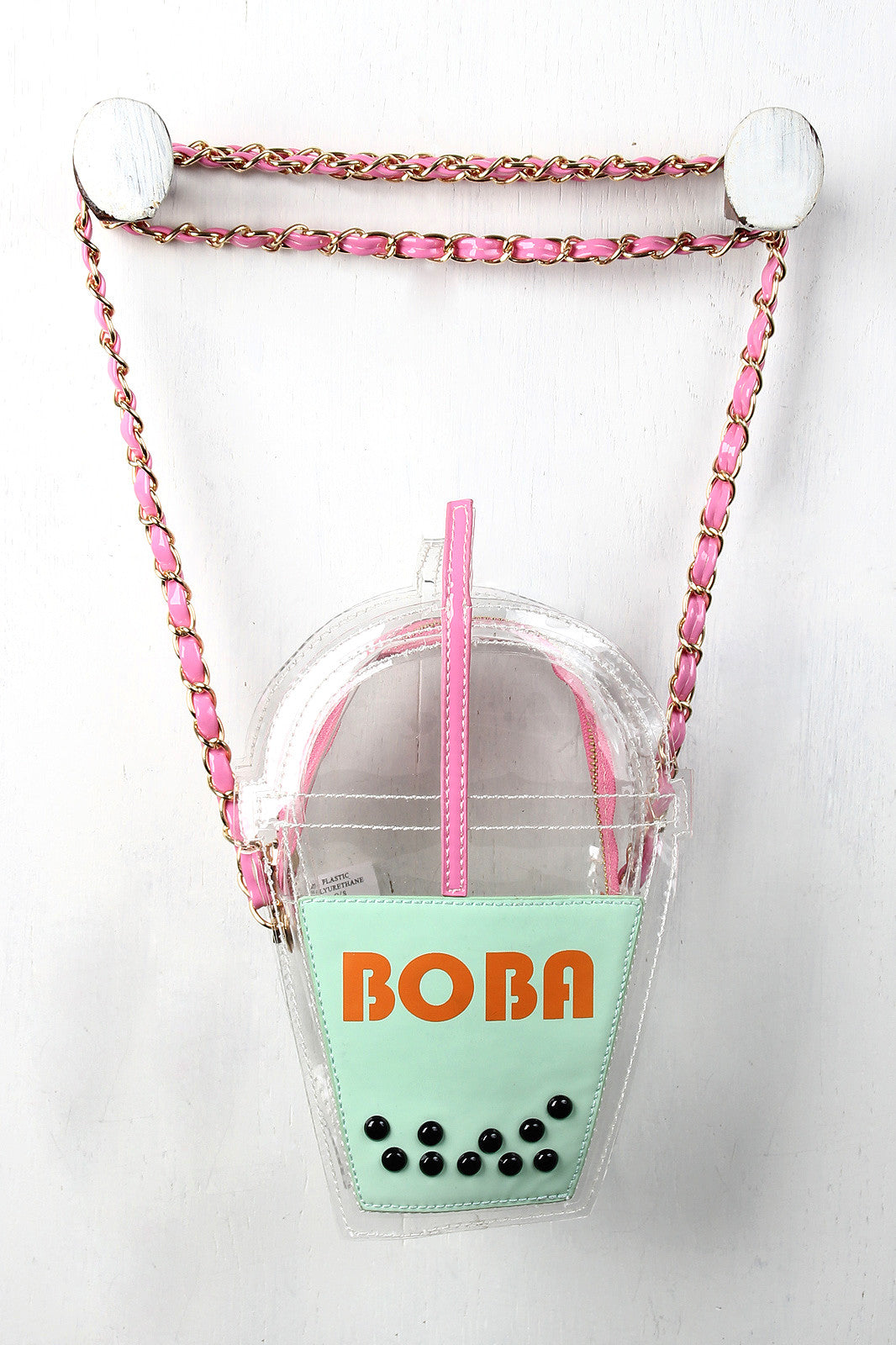 It's always boba time when you wear this Boba Cup Bag ! Featuring transparent PVC in the shape of a dome cup, stud embellishments representing boba, and a top zipper closure. Finished with a patent leather-threaded shoulder chain with a 21.5" drop.