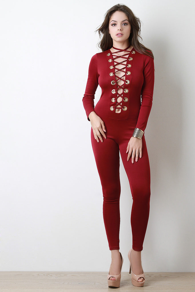 This bodycon self-lace-up design , large metallic grommets, and long sleeves. Finished with tapered legs. Accessories sold separately. Made in U.S.A. 95% Polyester, 5% Spandex.
