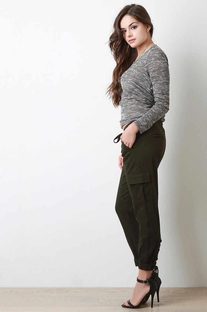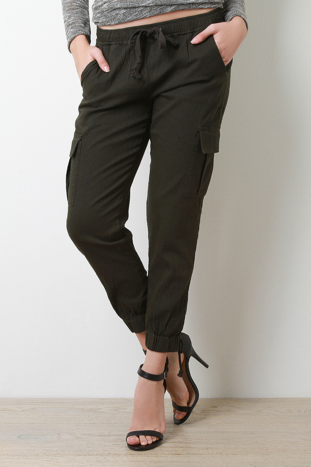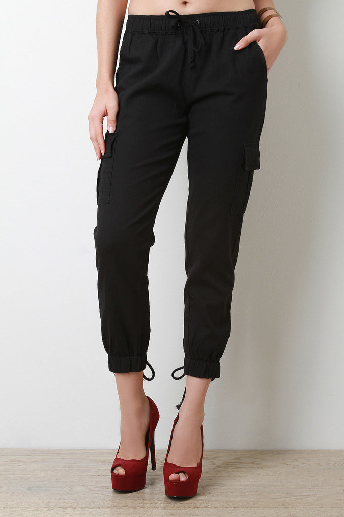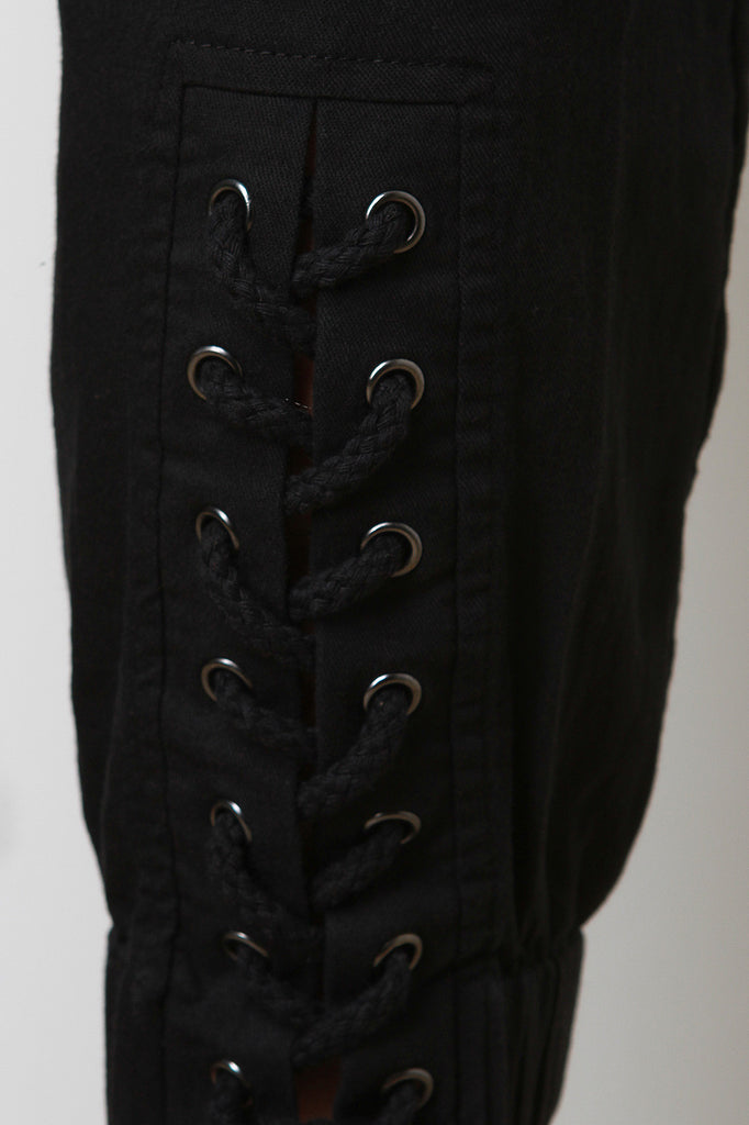 These jogger pants feature a wide elasticized waist with self-tie drawstring, side flap pockets, corset-style lace up detail, faux back pockets, and elastic band hem. Accessories sold separately. Self: 60% Cotton, 37% Polyester, 3% Spandex. Contrast: 100% Cotton.