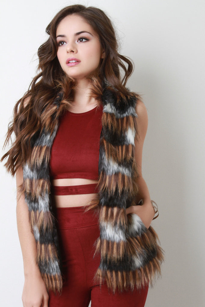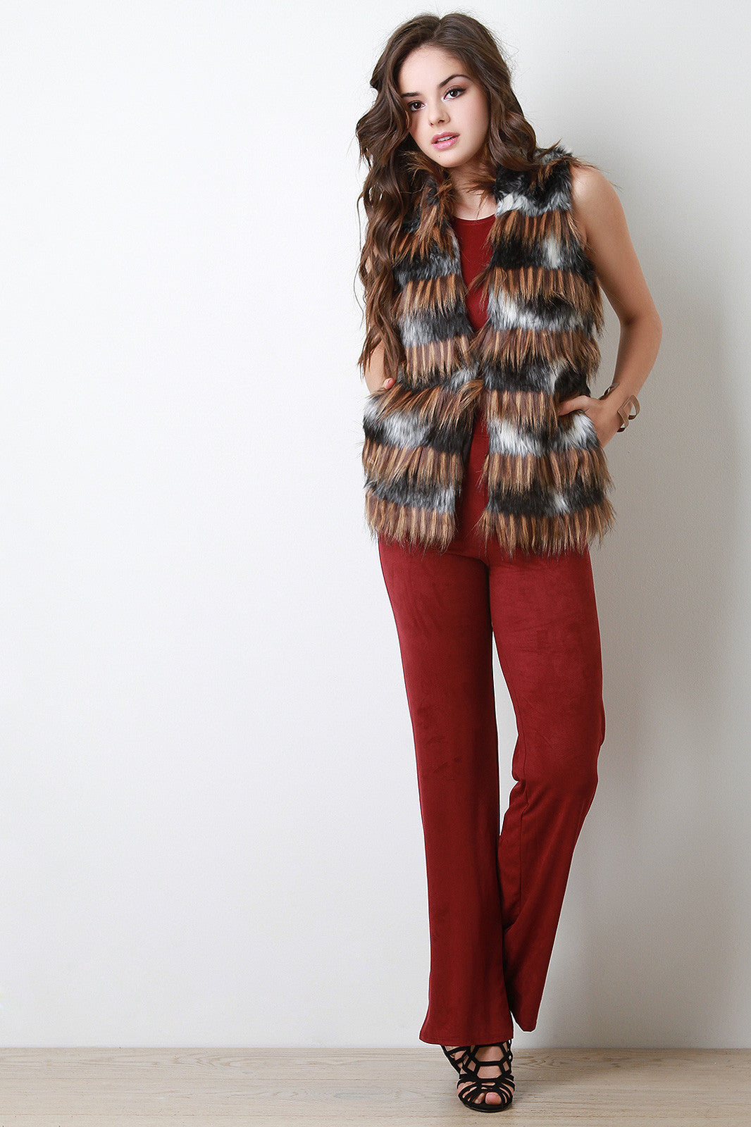 This cozy faux fur throughout, open front silhouette, and sleeveless design. Finished with hook and loop closure. Fully lined. Accessories sold separately. Self: 80% Polyester, 20% Acrylic. Lining: 100% Polyester.