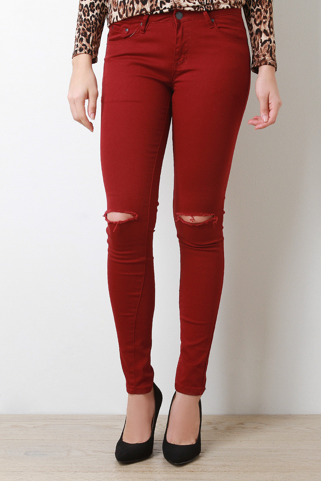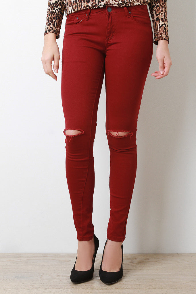 These denim knit fabrication, five belt loops, functional five pocket design, and ripped accents. Accessories sold separately. 97% Cotton, 3% Spandex.