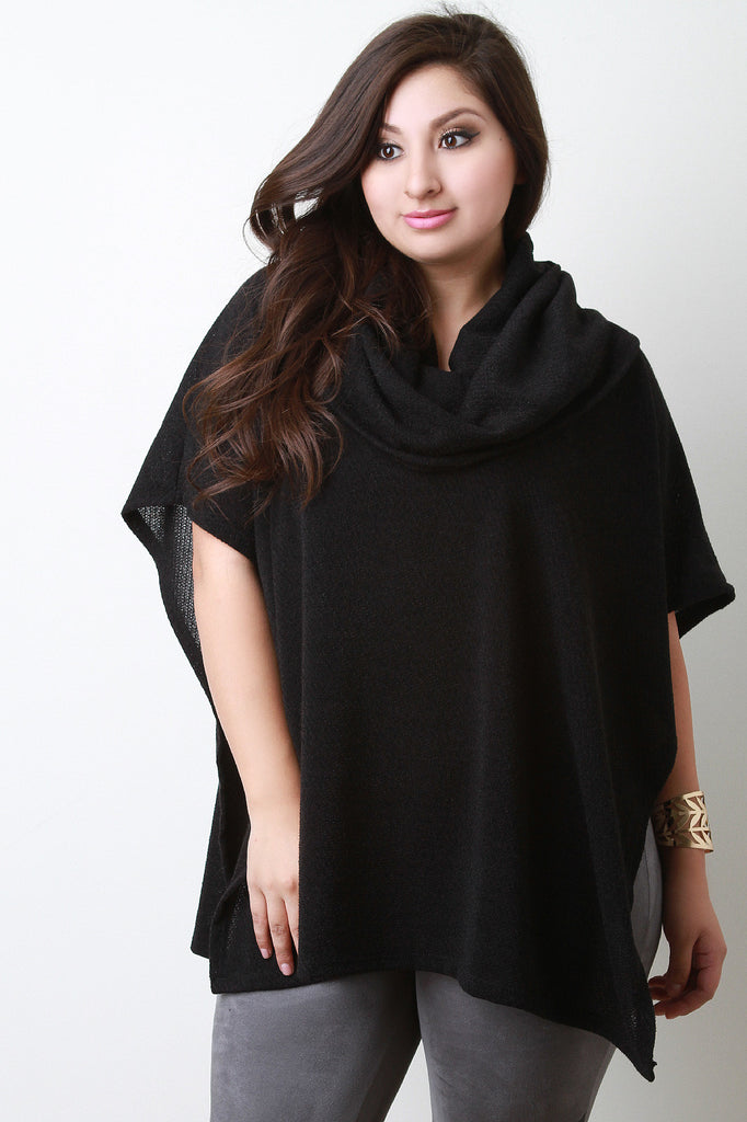 This plus size poncho top features a textured knit, turtleneck, and open sides. Accessories sold separately. Made in U.S.A. 95% Polyester, 5% Spandex.