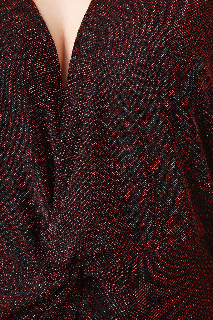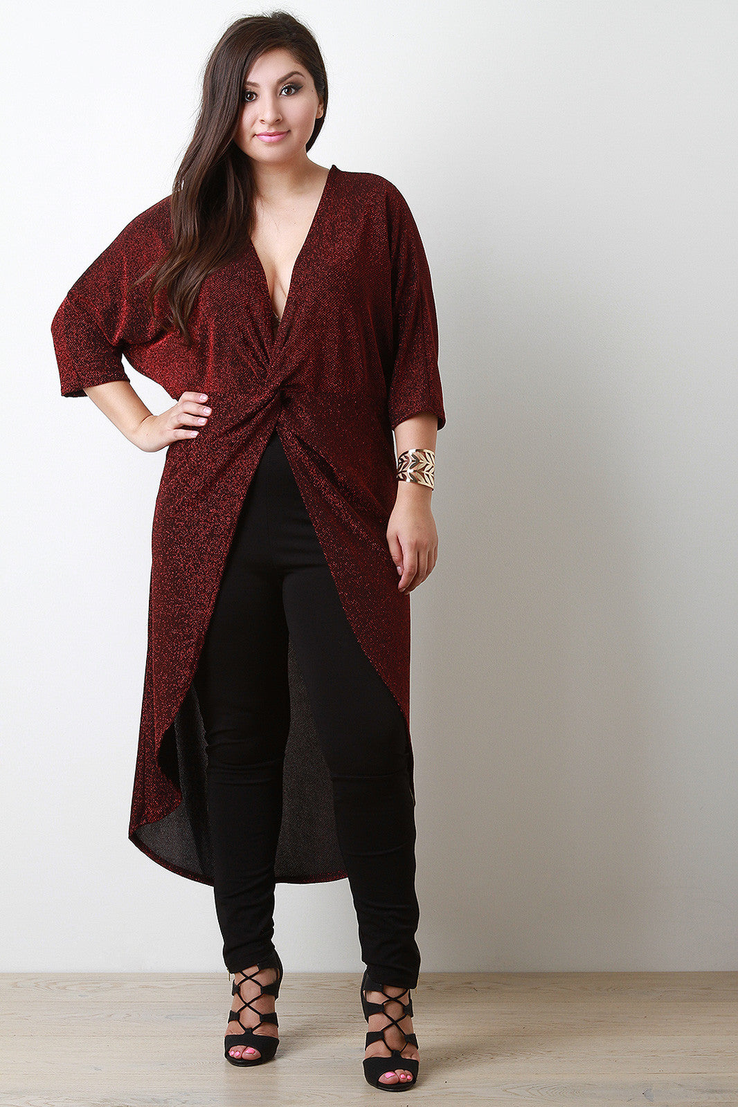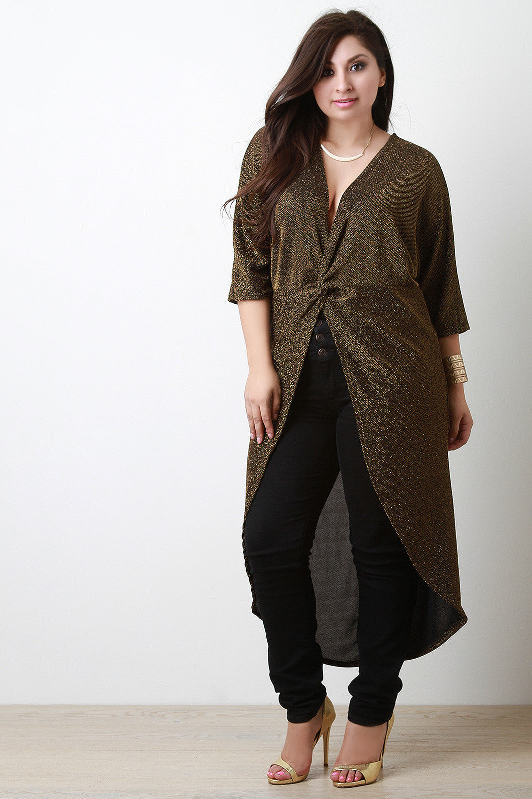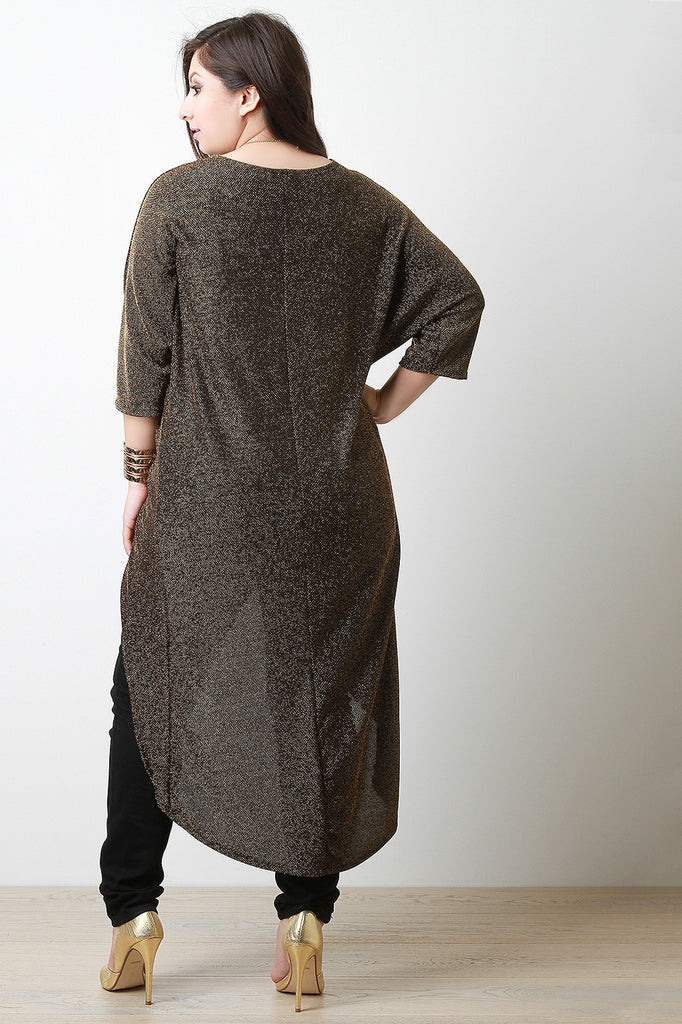 This top features a rough, glitter knit fabrication with a maxi length. Has a low, v-neck neckline with a high-low hemline. The hemline starts approximately on the hips and ends in the back around the ankles. Accessories sold separately. Made in U.S.A. 92% Polyester, 8% Spandex.