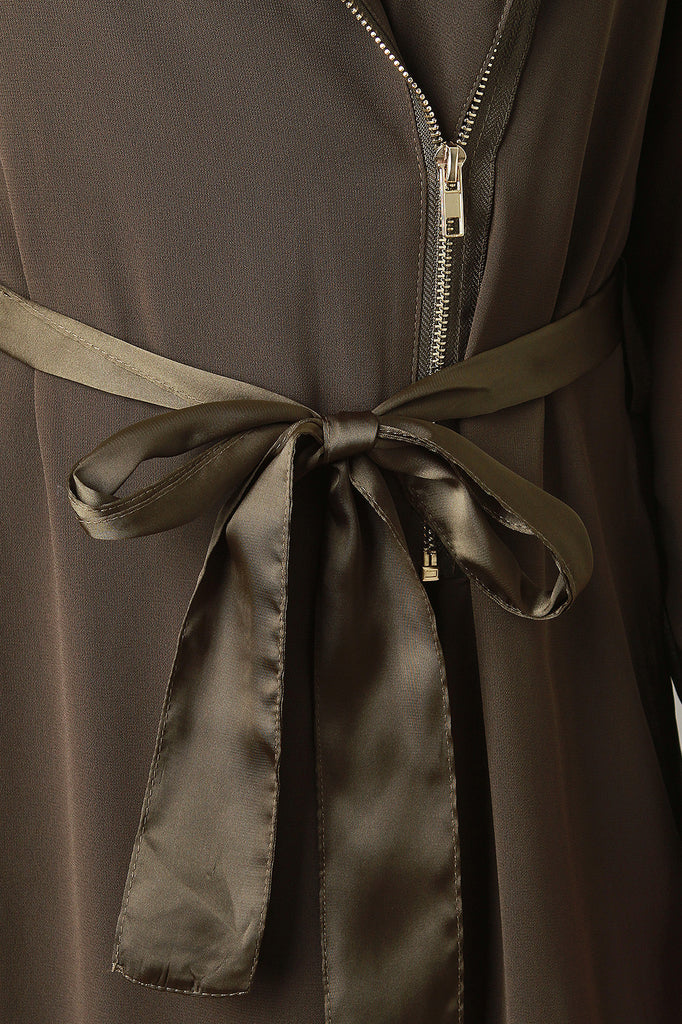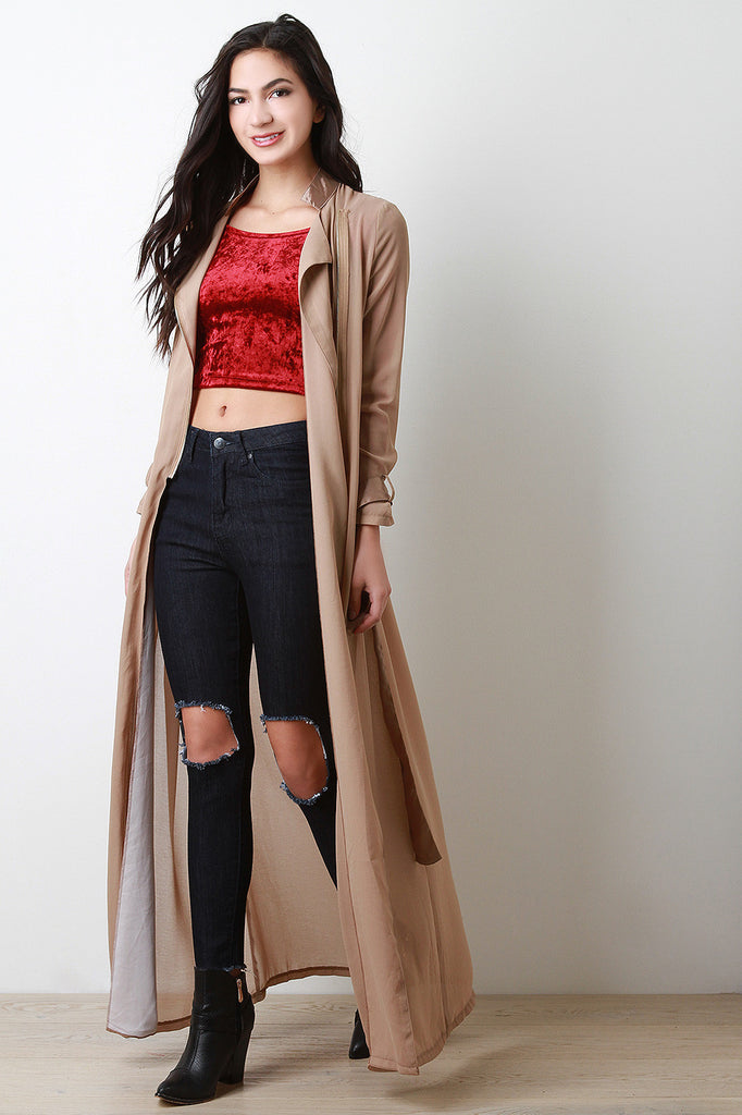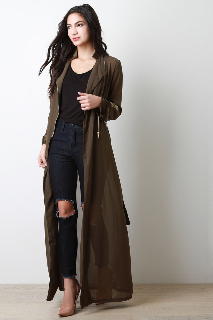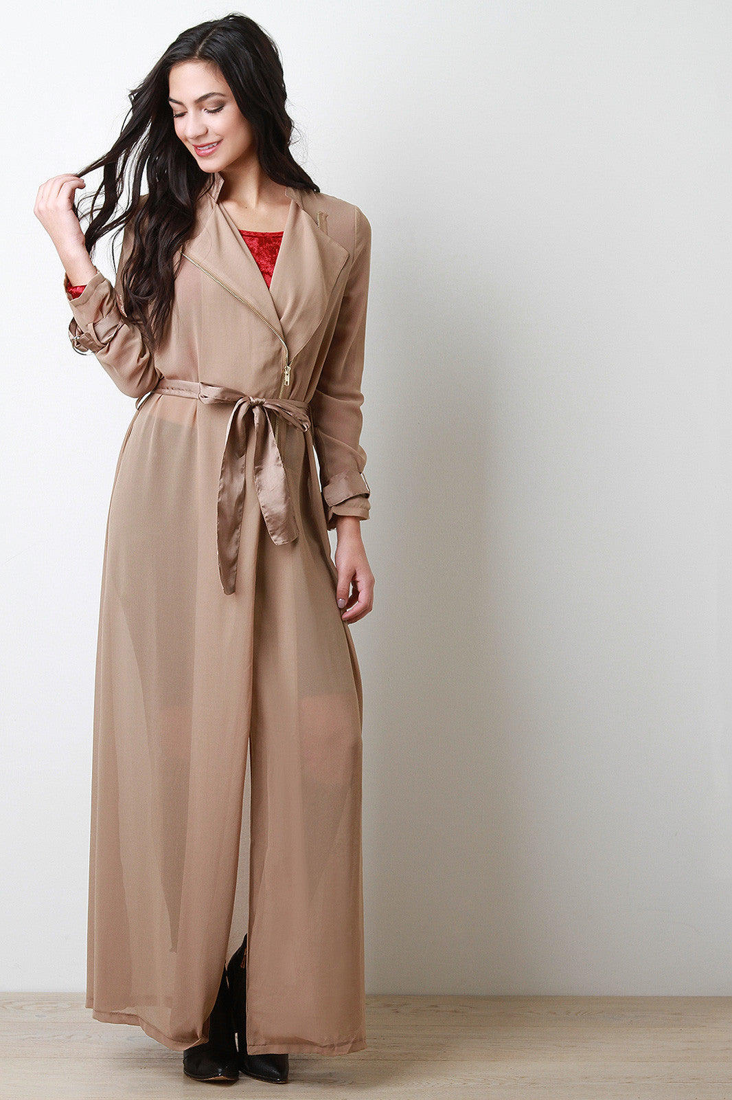 This jacket features a sheer knit fabrication with a moscod mandarin collar with long sleeves and two belt loops on the cuffs of the sleeves. Has a zipper on the higher section of the jacket. After the sipper, this jacket has an opening starting from the end of the zipper about mid-waist and ends on the hem. Includes a shinny polyester belt. Accessories sold separately. 100% polyester.