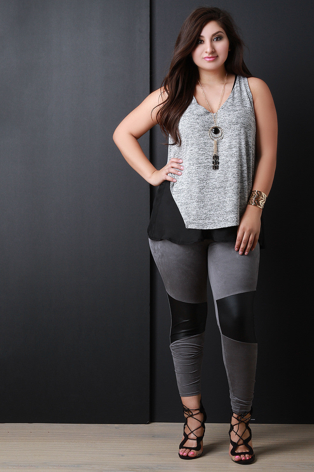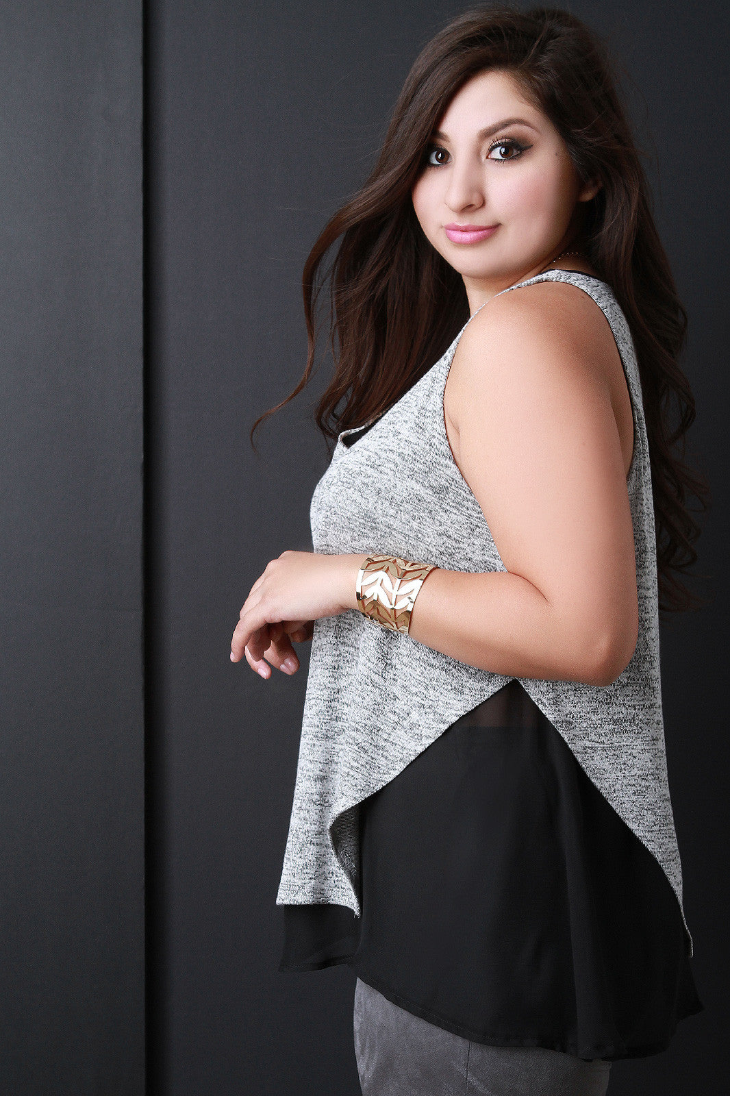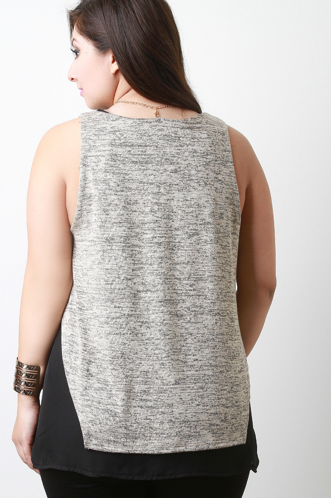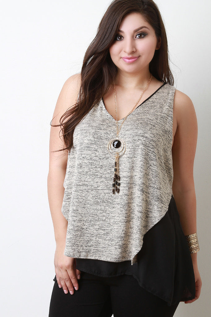 This plus size top was designed with a boxy chiffon underlay and an asymmetrical hem heathered overlay. It is sleeveless and v-neckline bodice. Necklace is included, other accessories sold separately. 49% Rayon. 47% Polyester. 4% Spandex. Con: 100% Polyester.