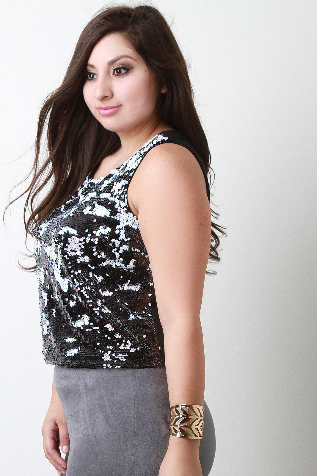 This plus size sleeveless top features a round neckline, two-tone sequined front, and a full-length metallic back zipper. Accessories sold separately. 100% Polyester.