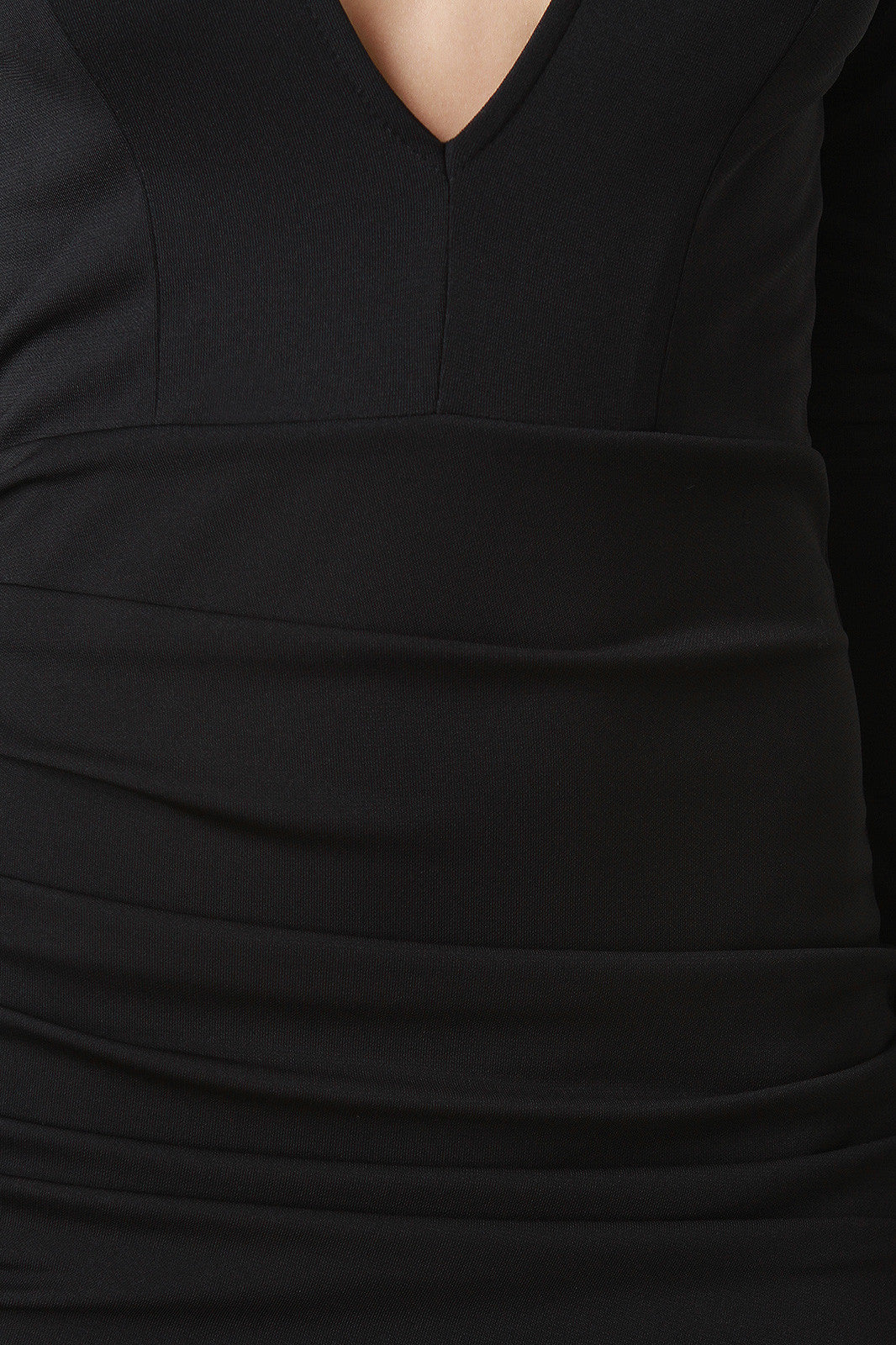This midi dress features smooth stretch knit, deep v-neckline, long sleeves, ruched side, layered asymmetrical skirt, and finished with hidden back zipper closure. Accessories sold separately. Made in U.S.A. 92% Polyester, 8% Spandex.