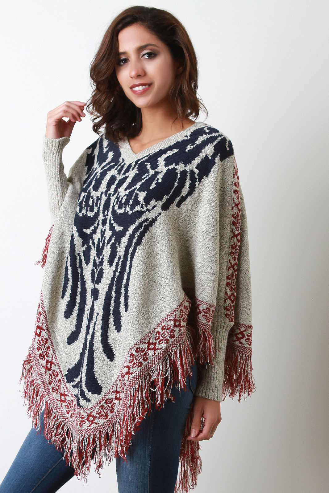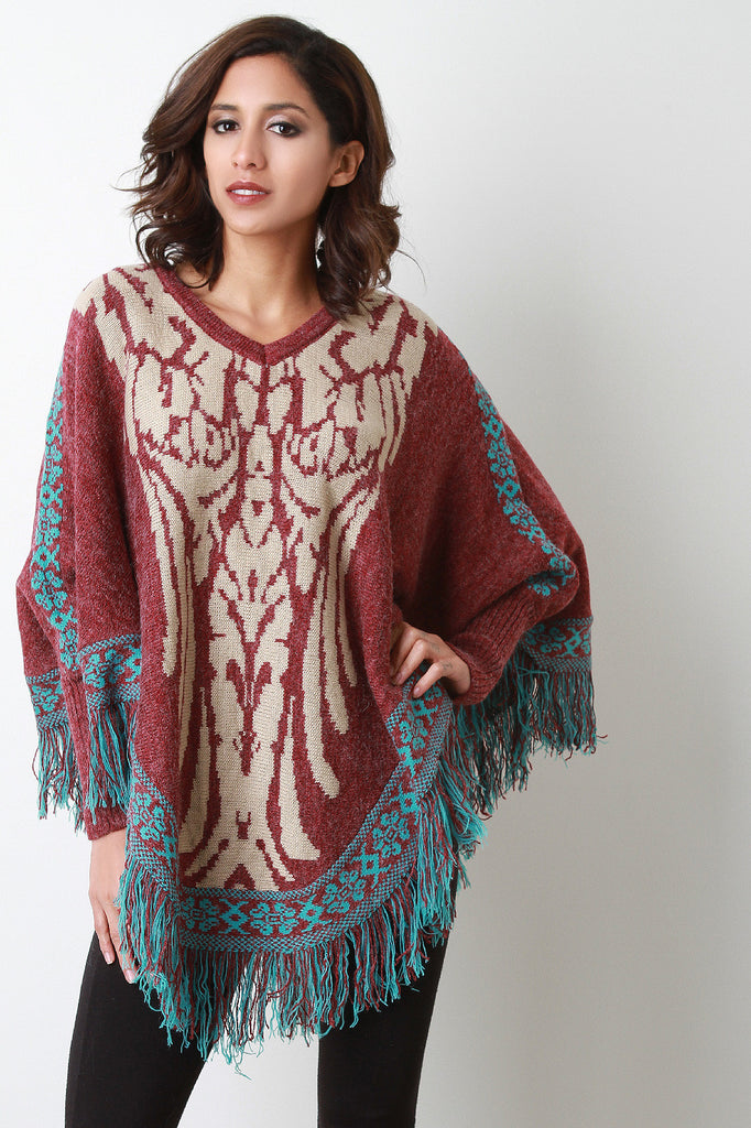This poncho features thick knit, southwestern pattern, v-neckline, dolman sleeves with rib knit cuffs, open sides, and finished with asymmetrical fringed hemline. Accessories sold separately. 85% Acrylic, 15% Wool.