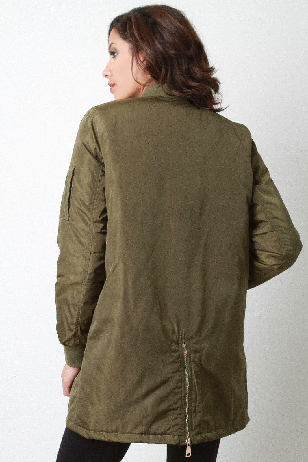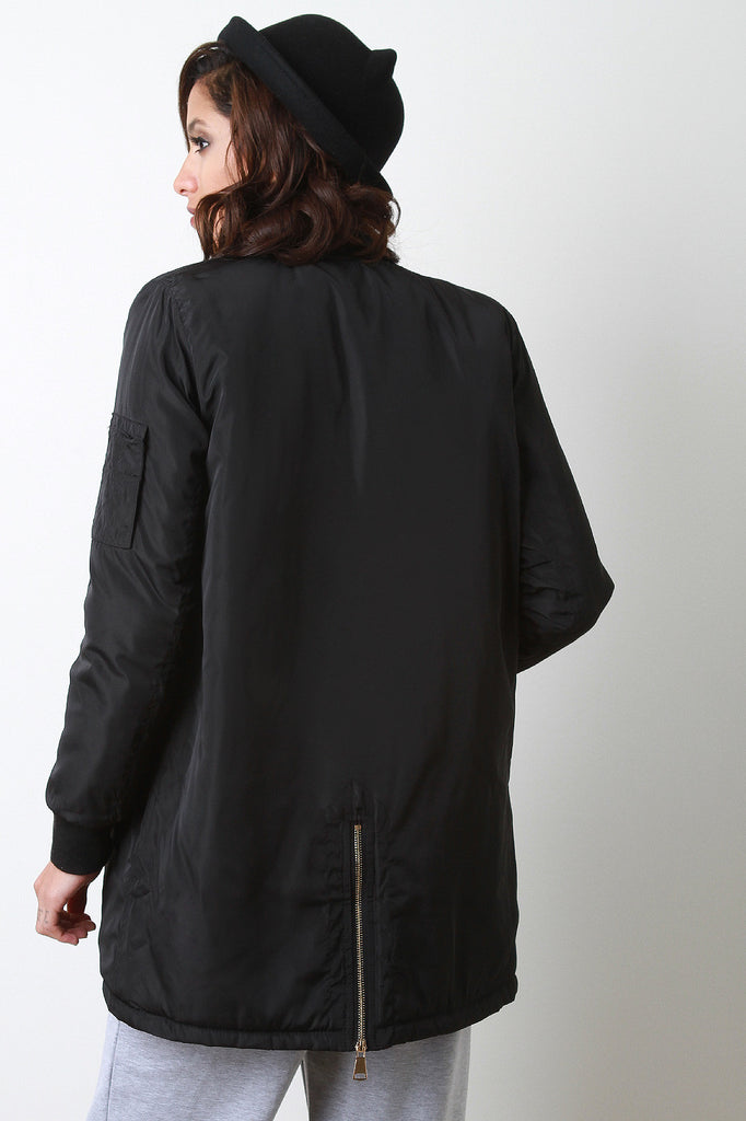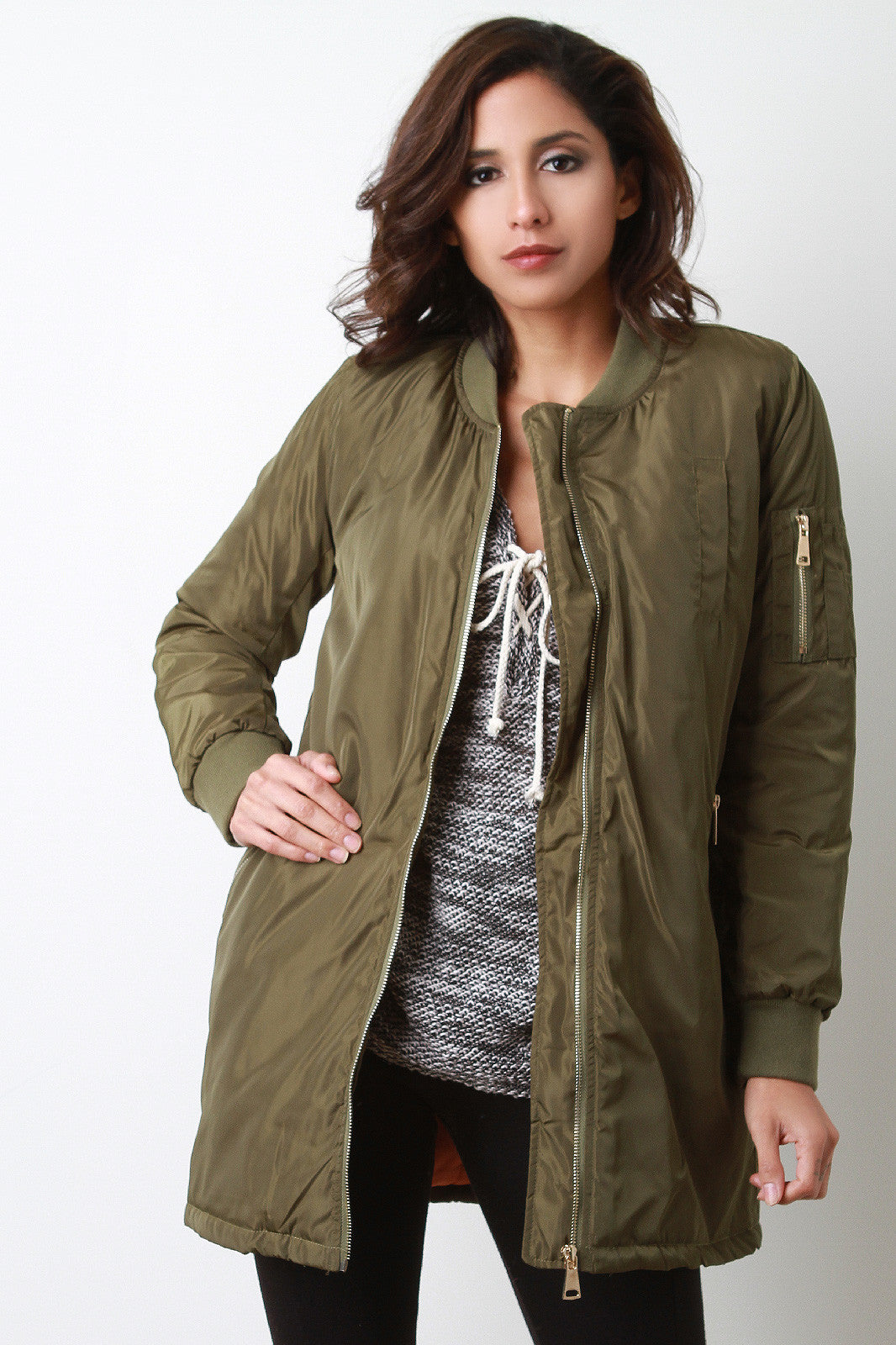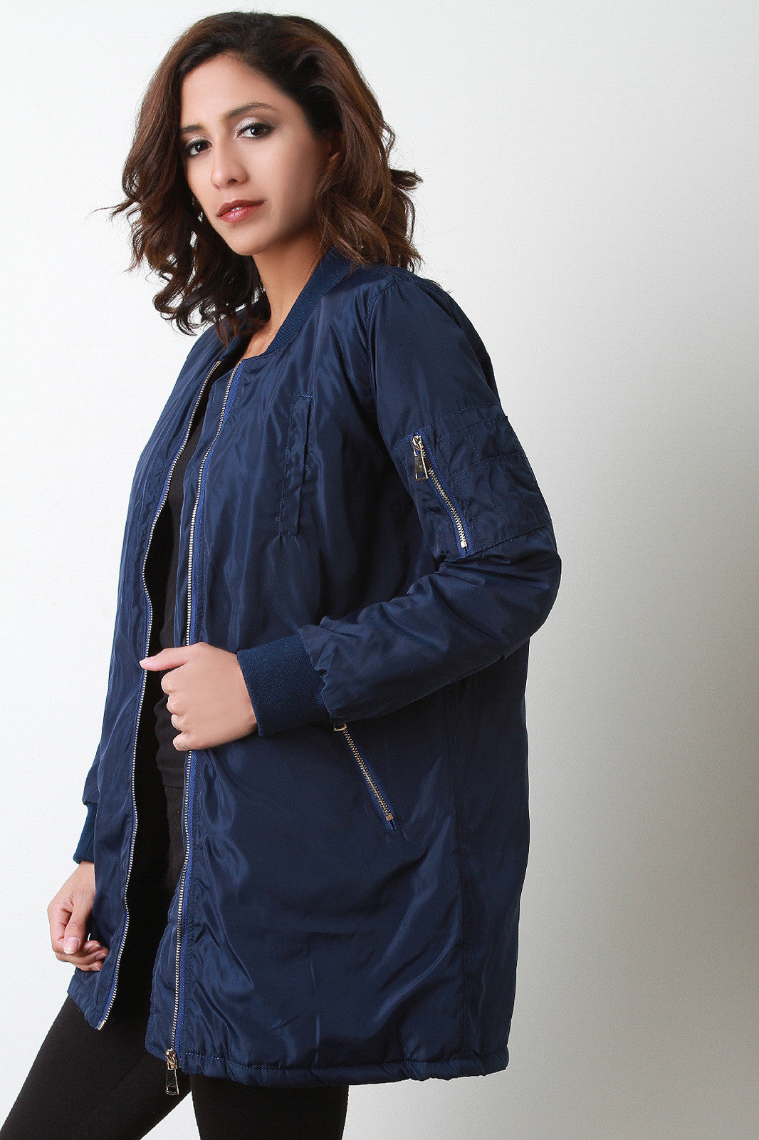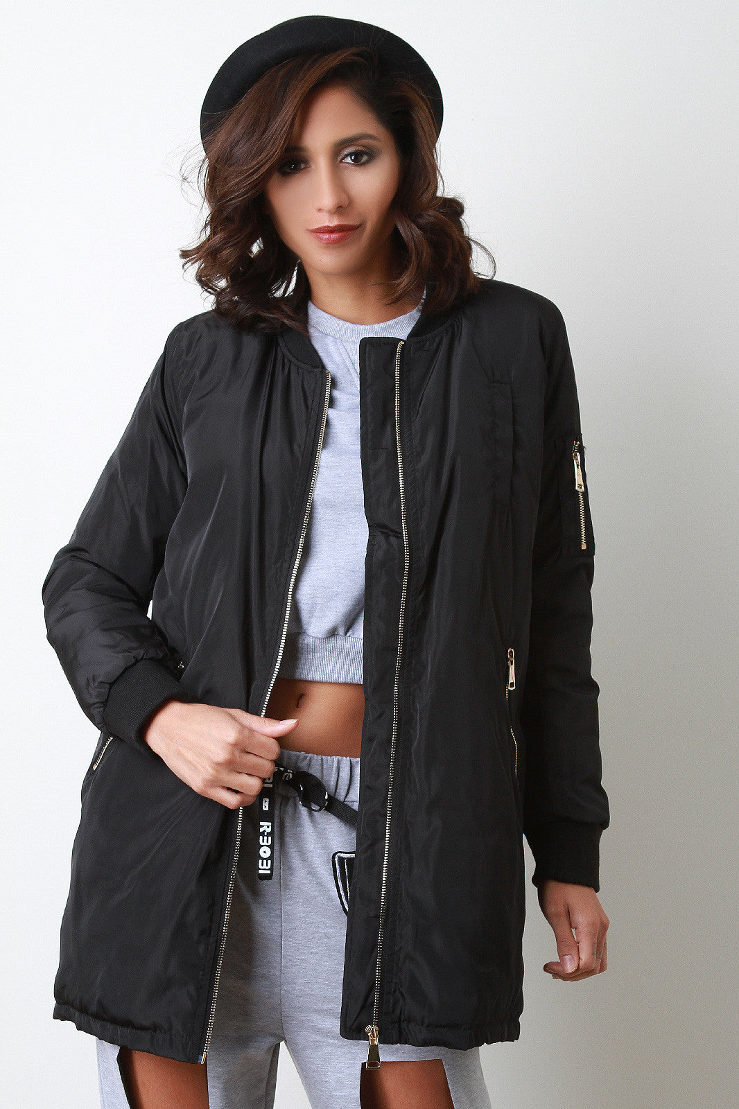 This bomber jacket features zip-up front, long sleeves, two pockets, zipper accents, rib knit trim, and longline design. Accessories sold separately. 100% Polyester.