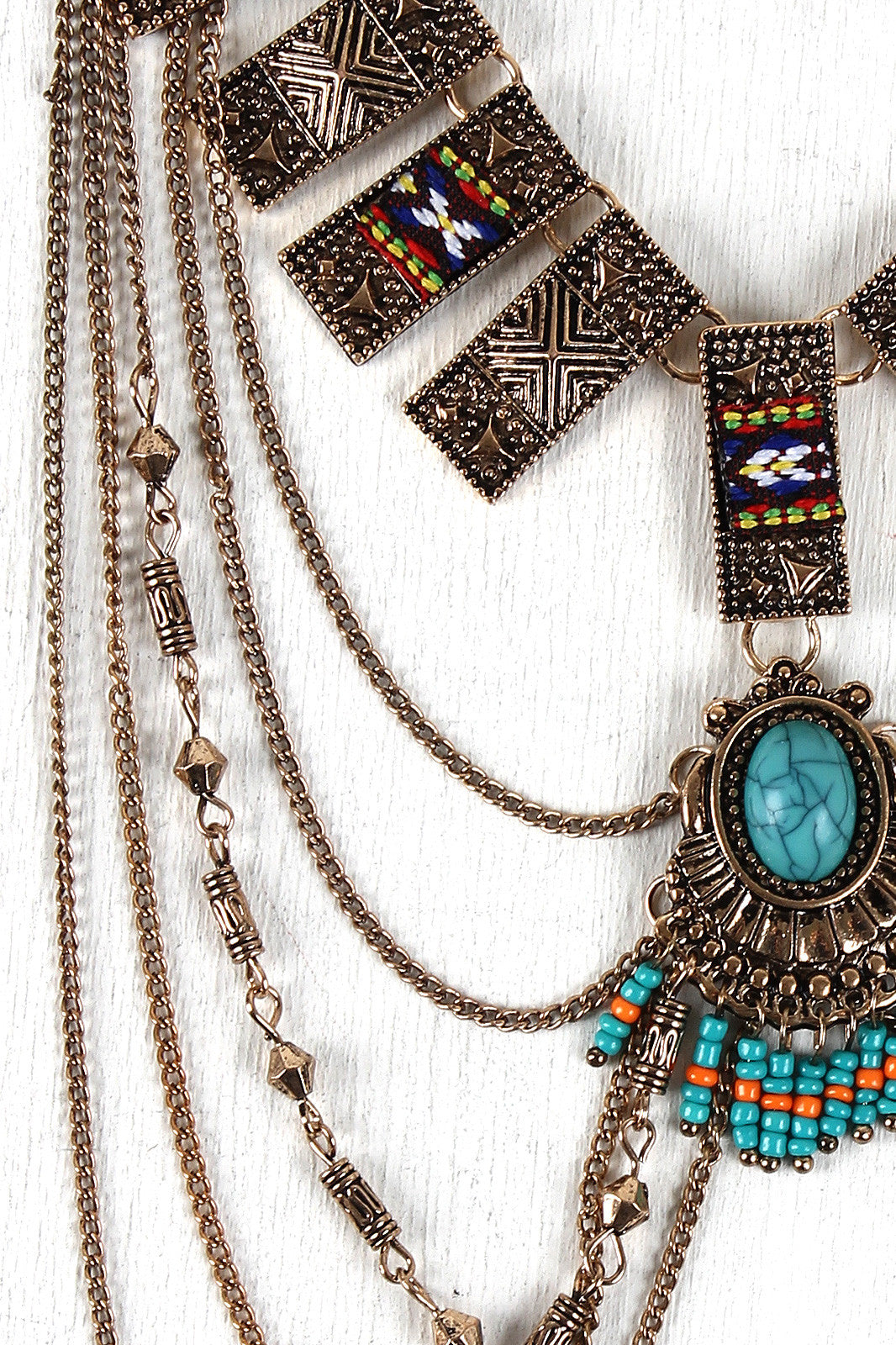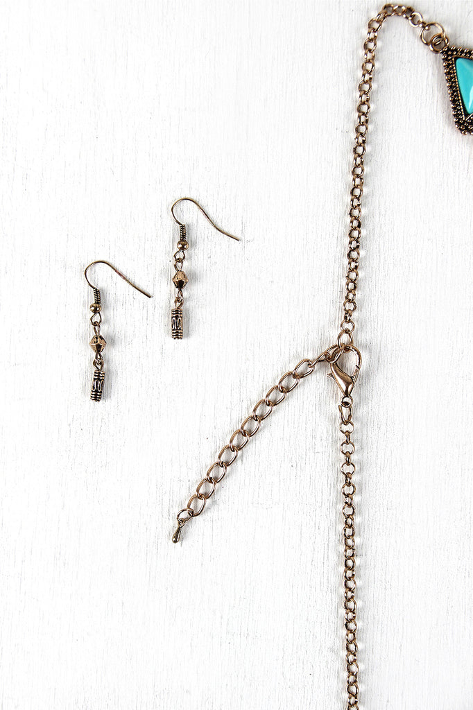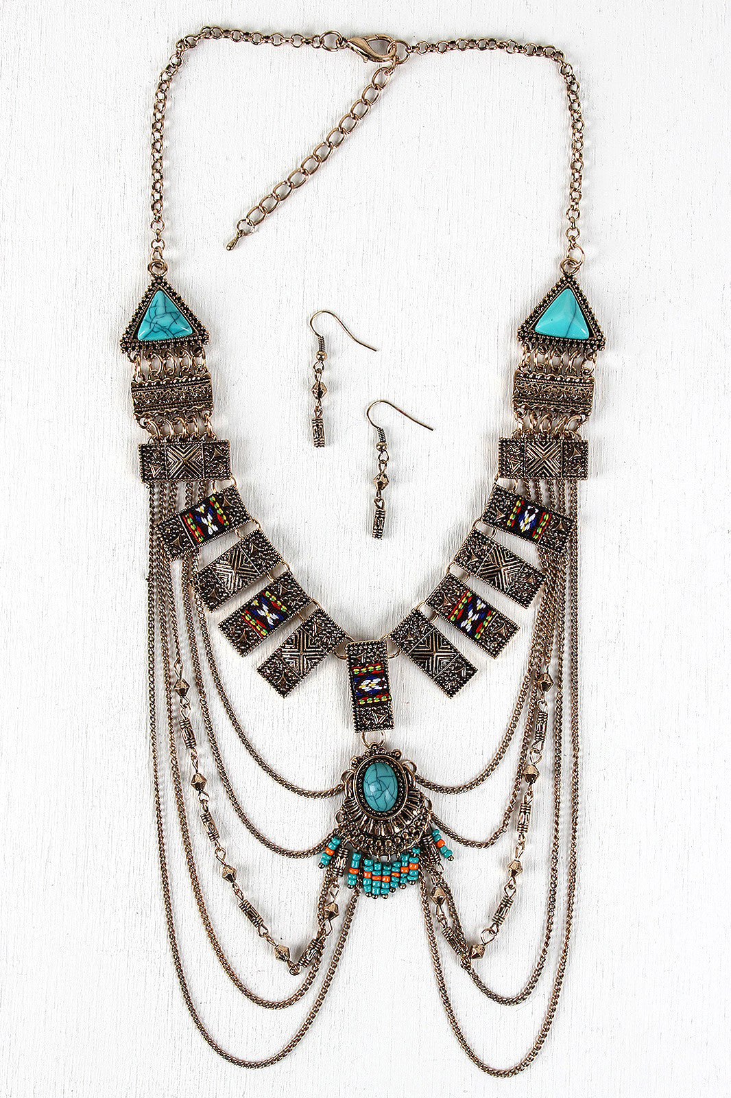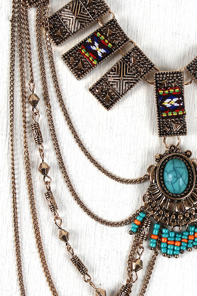 This necklace features tribal textured bars, faux turquoise stone accents, seed bead fringe, and draping chains. Finished with an adjustable lobster hook closure and includes matching earrings.