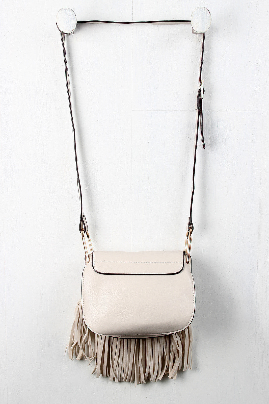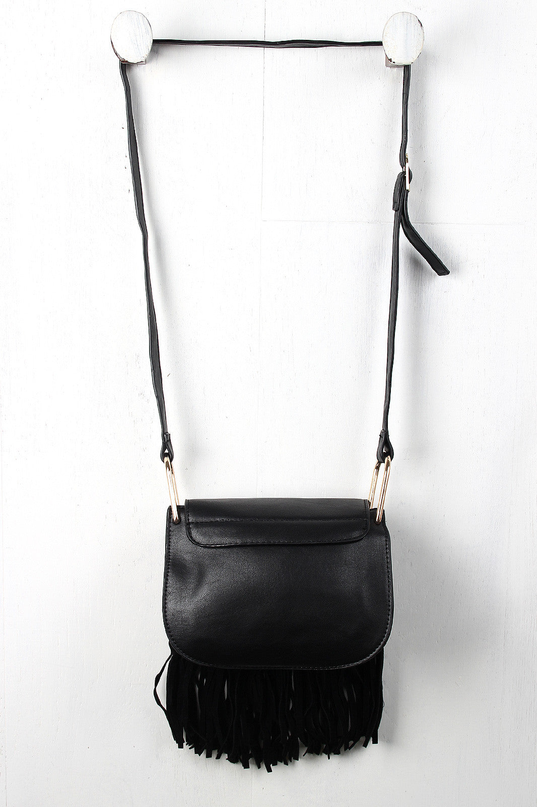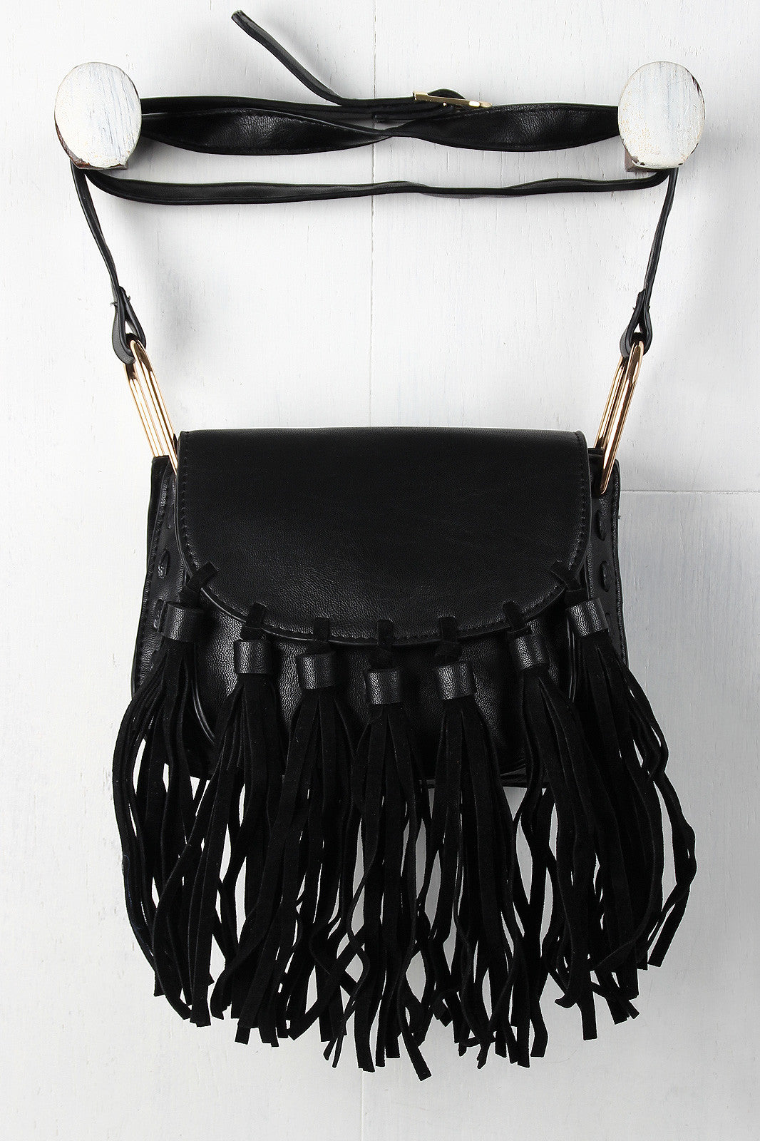 A structured tassel-fringed flap with magnetic button, and stitching detail along the edge. Under the flap the bag has one front slip pocket and a lined main compartment with a zipper pocket on the back wall. Bag is finished with glossy metallic U-shape hardware at the sides that links the bag to the adjustable buckle shoulder strap (20" drop).