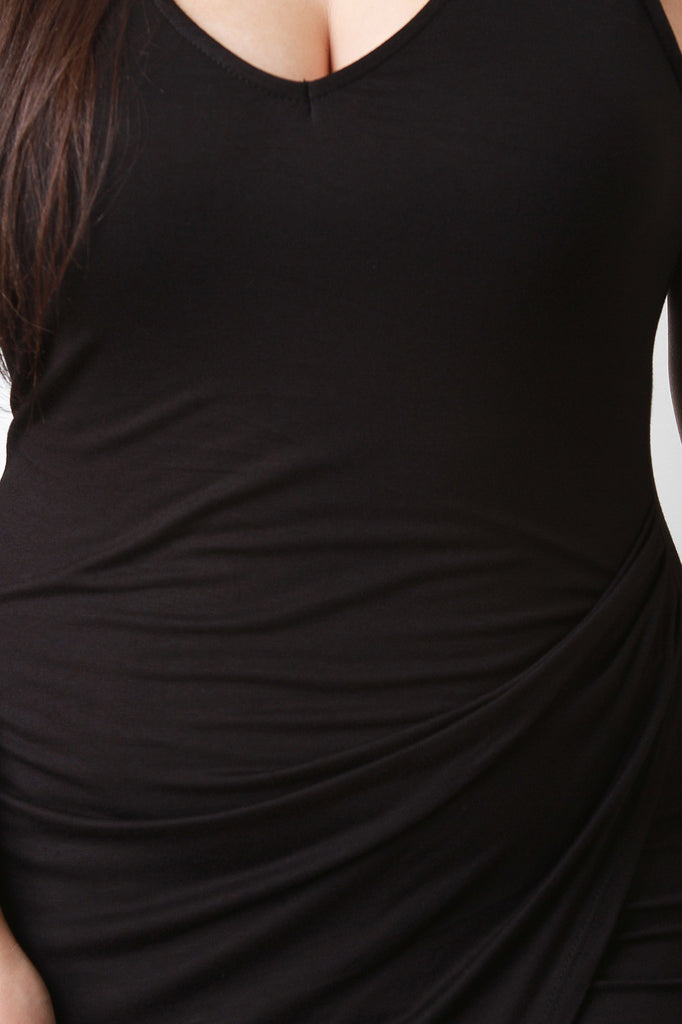 This plus size curve hugging dress is v-neckline, front and back, and sleeveless bodice. Mini dress structure with a slanted draped side. Accessories sold separately. 95% Rayon. 5% Spandex.