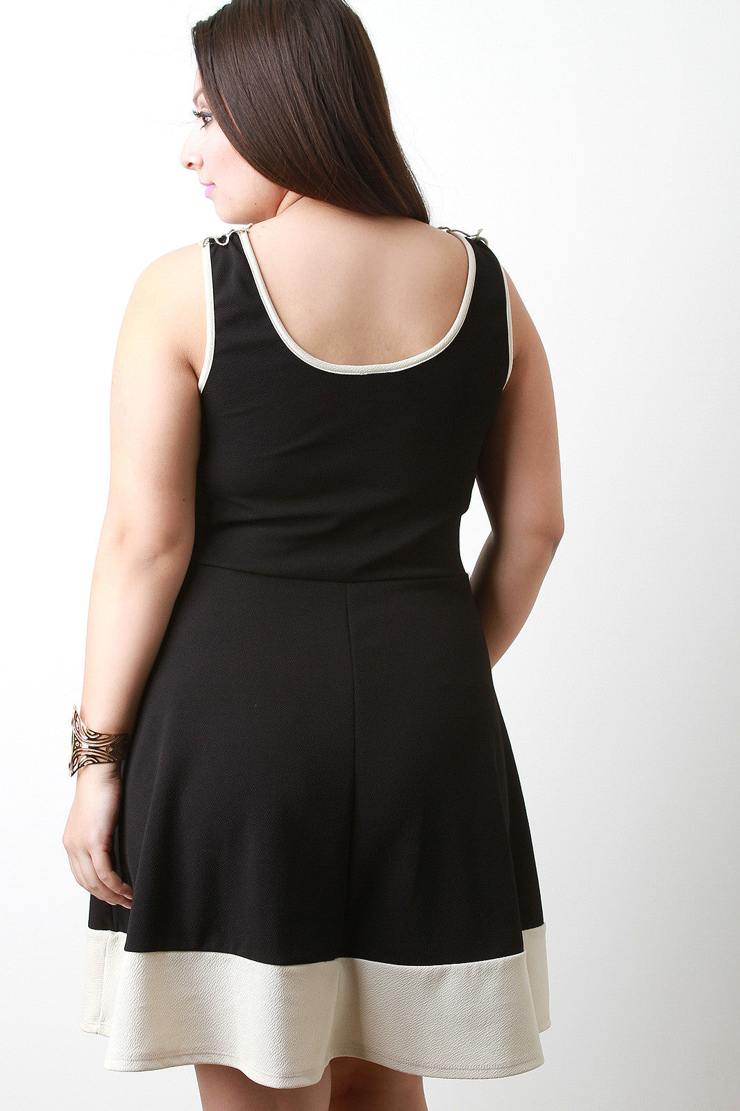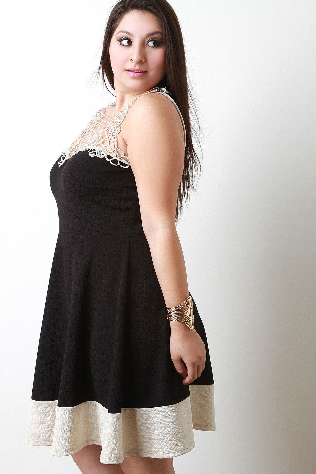 This plus size skater dress features a semi-sheer lace yoke, round neckline, sleeveless construction, cinched waist seam, skater flare skirt, and contrasting trim hemline. Accessories sold separately. Made in U.S.A. 96% Polyester, 4% Spandex.