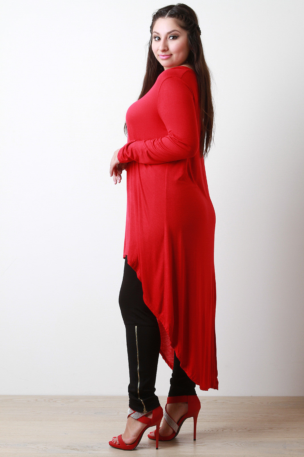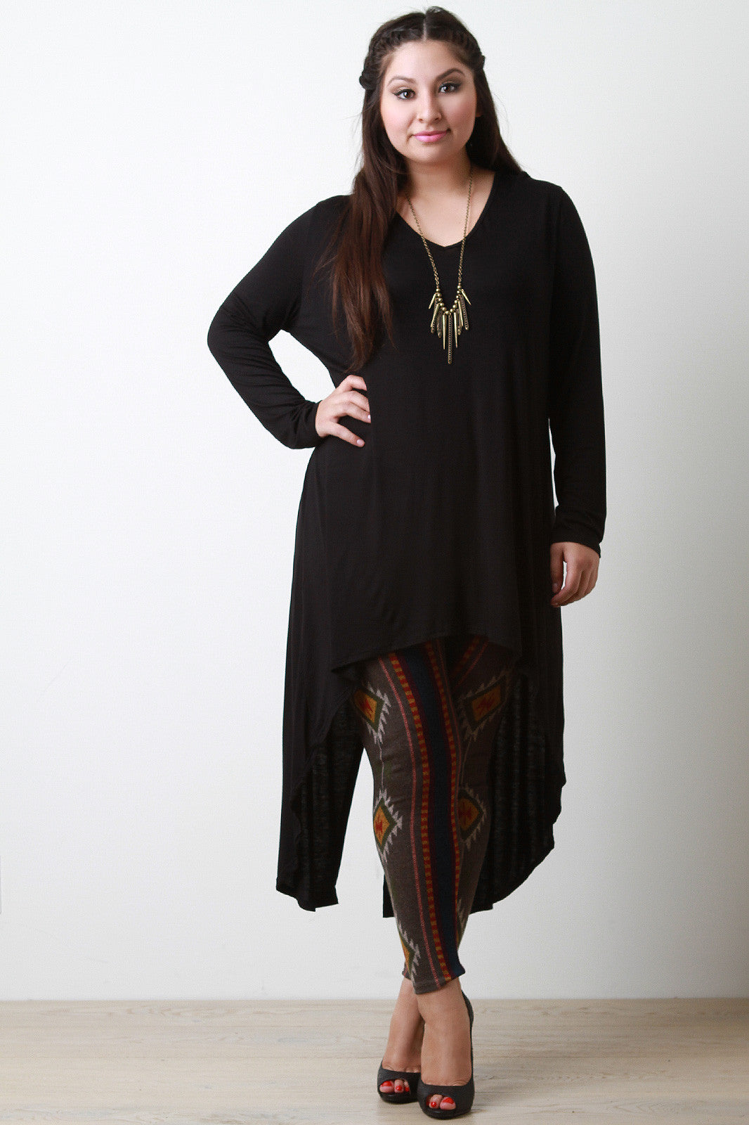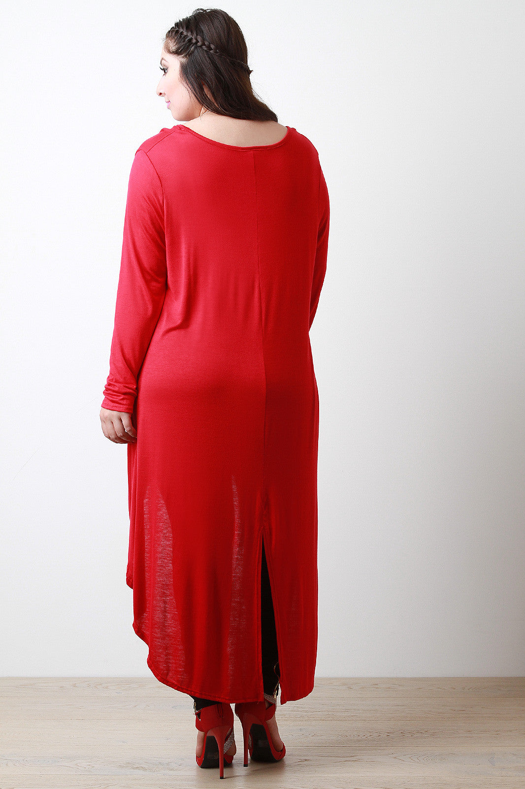 A plus size jersey knit maxi top featuring a v-neckline, long sleeves, and a high-low hemline with a vented back hem. Accessories sold separately. Made in U.S.A. 95% Rayon, 5% Spandex.