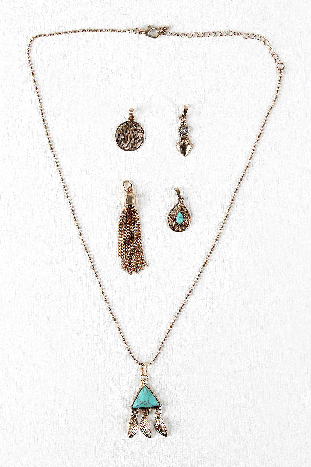 This set includes a cable chain necklace with an adjustable lobster hook closure and five unique pendants that you can change out or stack on the chain for different looks! Includes a pointed rhinestone charm, cutout disk, a curb link chain tassel, a drop shape with turquoise center, and a triangular turquoise stone with glossy feather charms.
